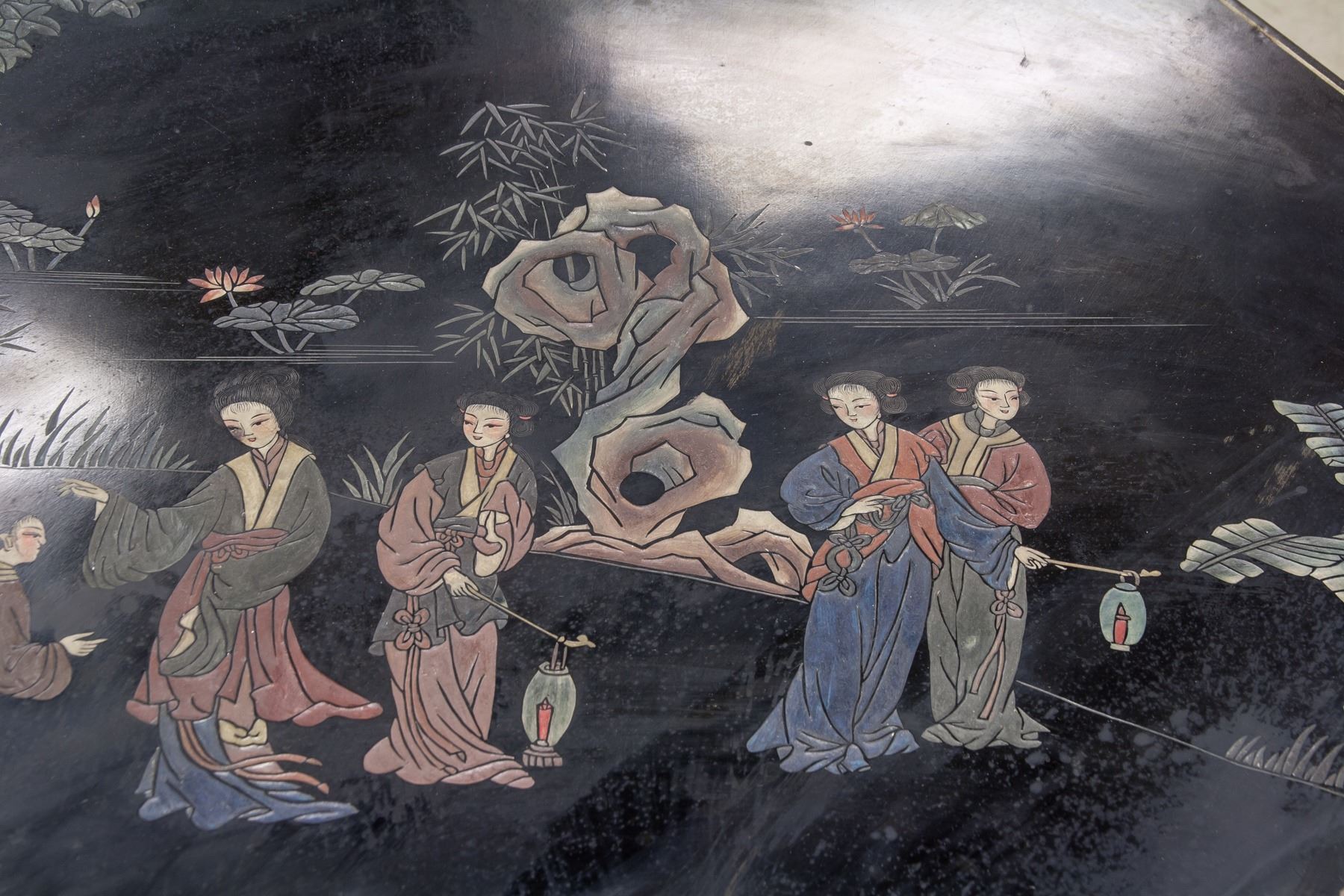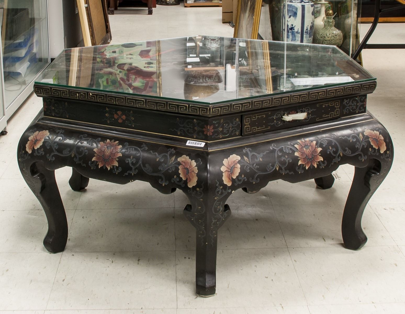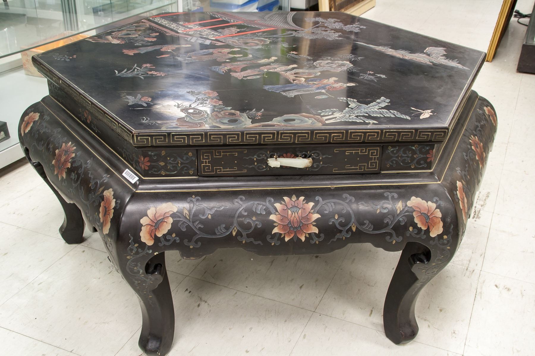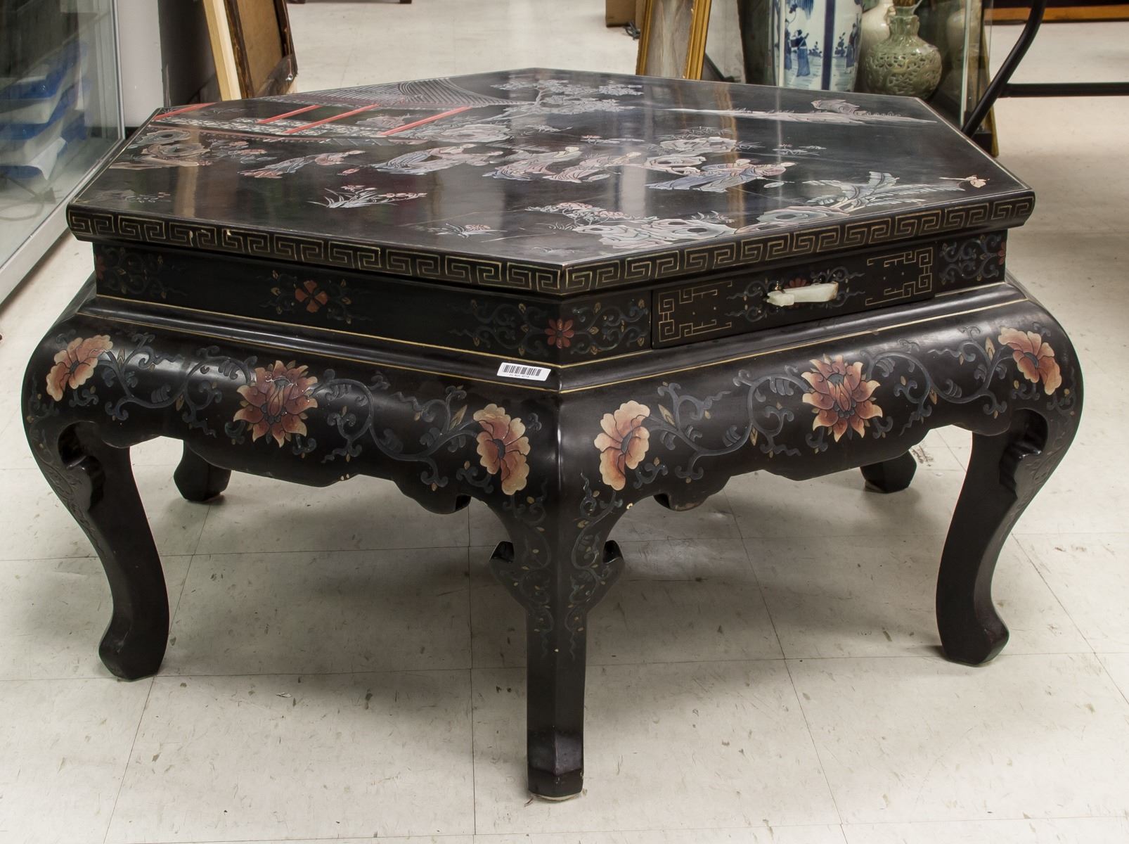 Japanese black lacquer wood table, of hexagon shape top, supported on six curved legs, top painted with beauties, side painted with floral and geometric pattern, two drawers and jade carved dragon form handles, with glass cover, 48 x 100 x 100 cm