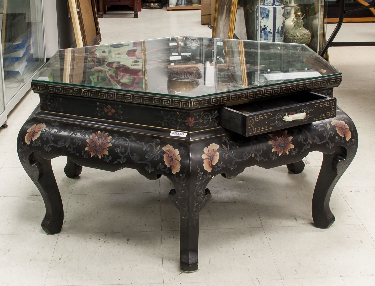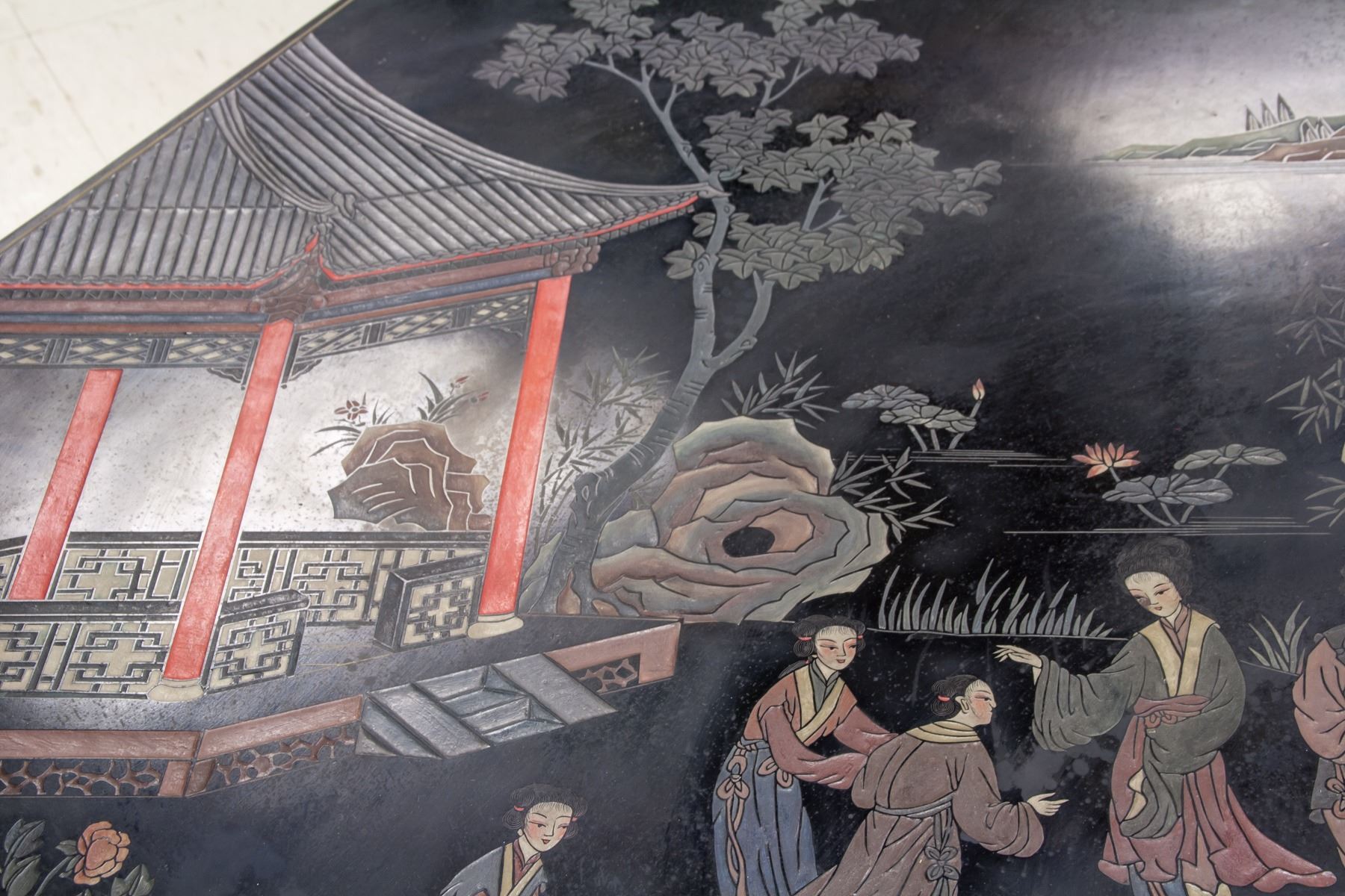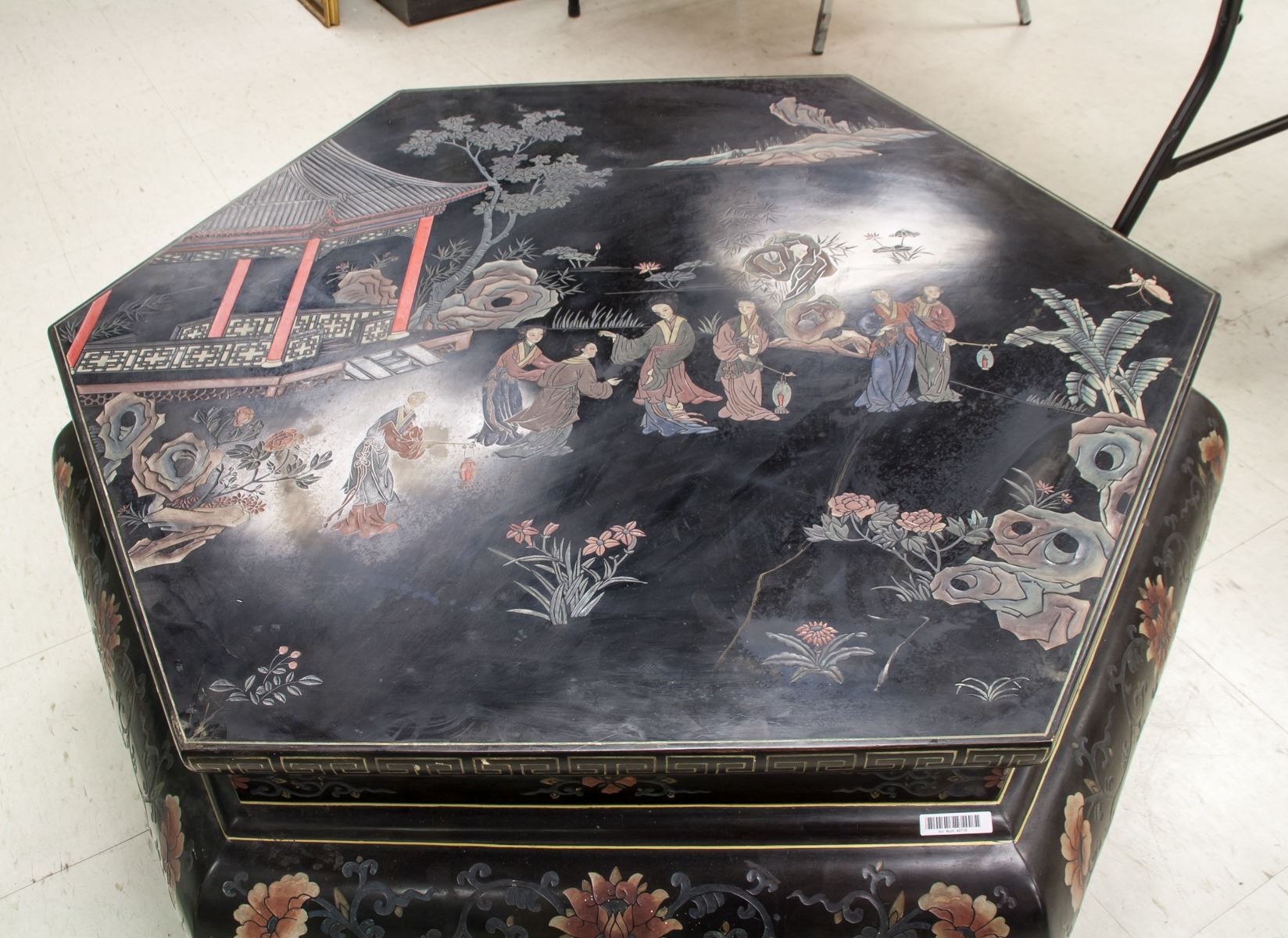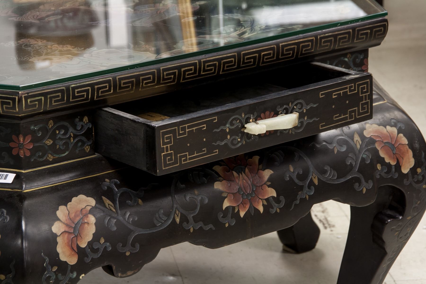 Japanese black lacquer wood table, of hexagon shape top, supported on six curved legs, top painted with beauties, side painted with floral and geometric pattern, two drawers and jade carved dragon form handles, with glass cover, 48 x 100 x 100 cm