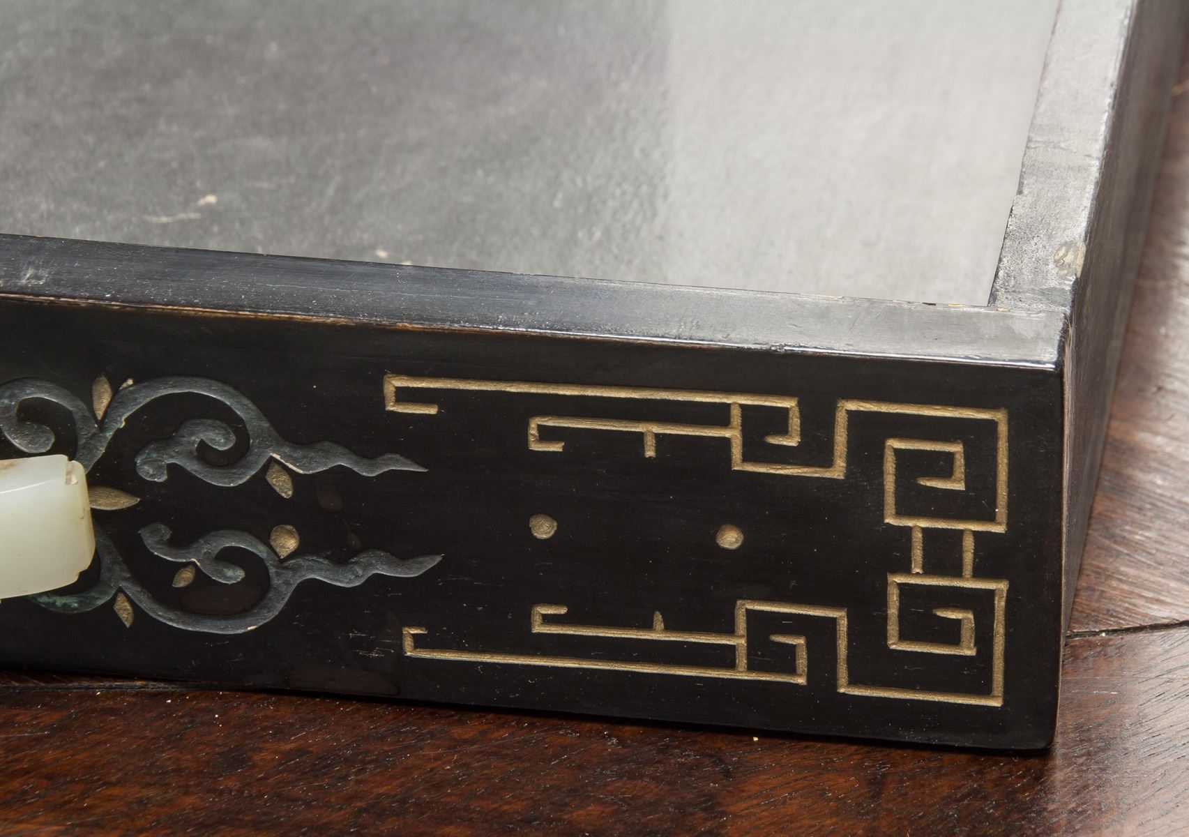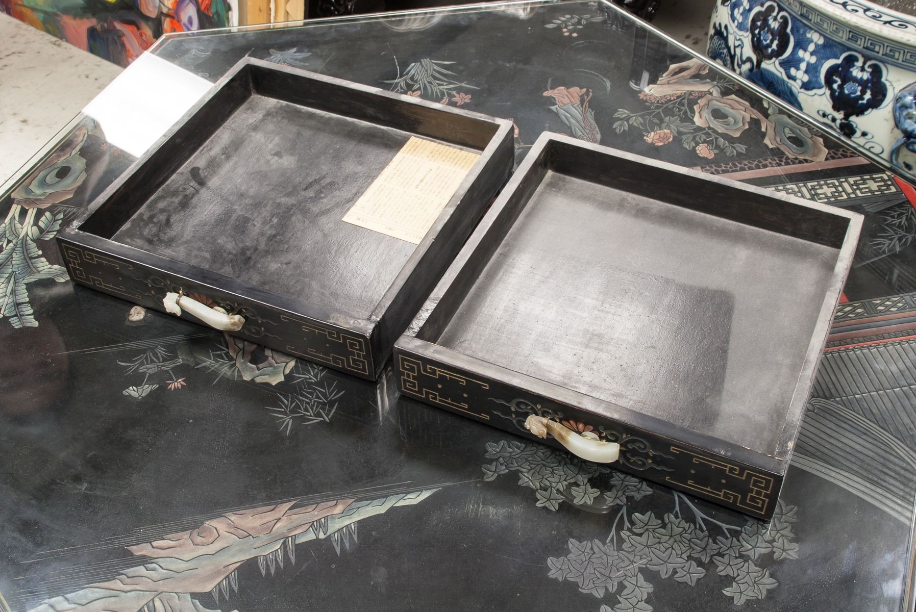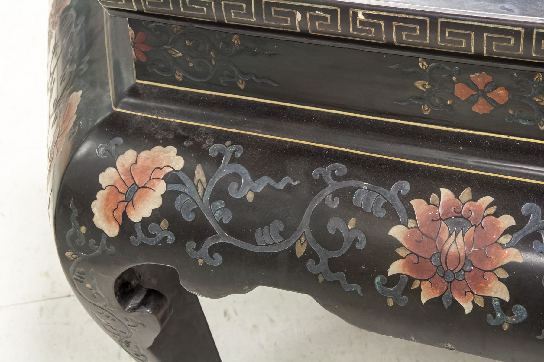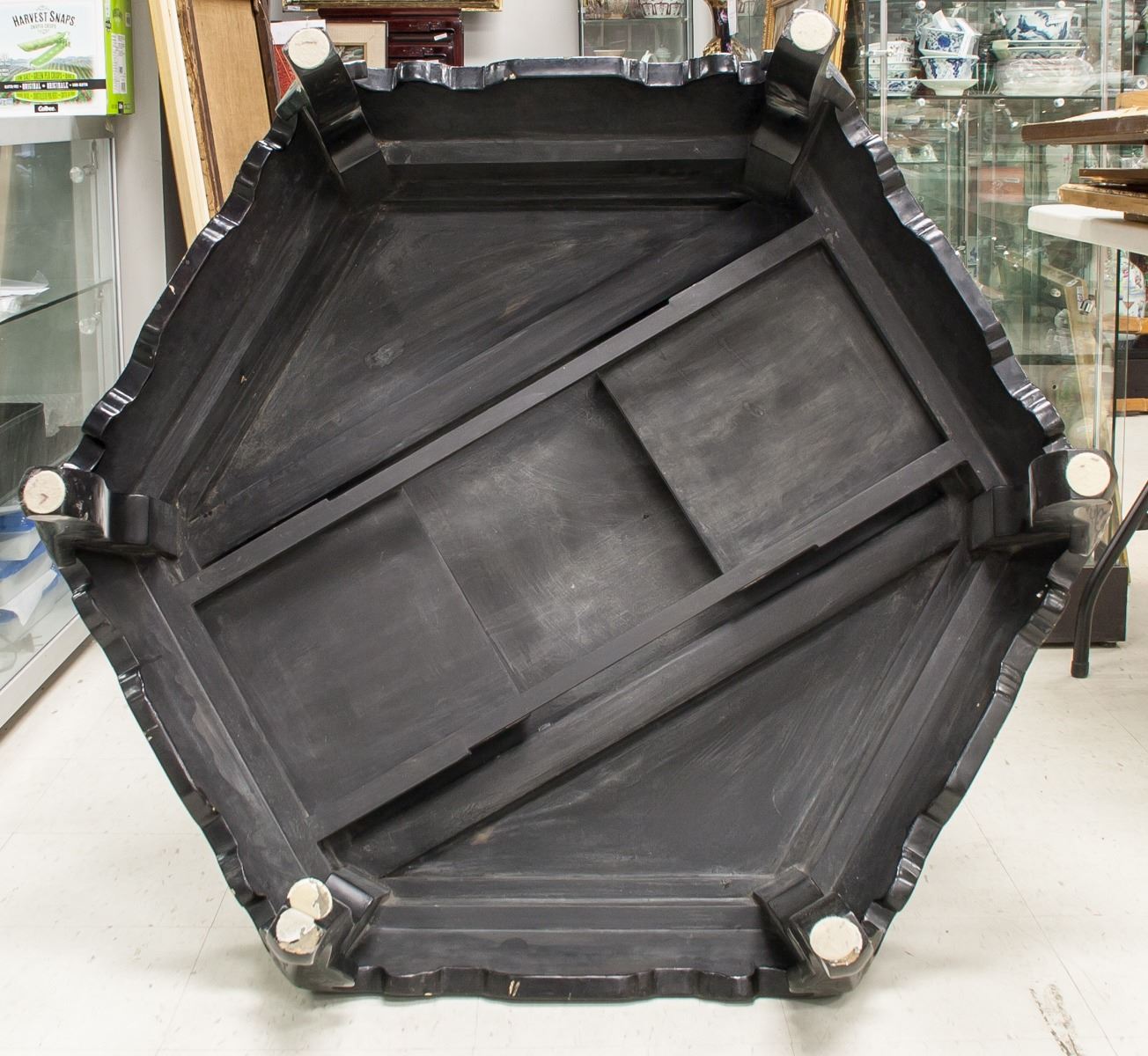 Japanese black lacquer wood table, of hexagon shape top, supported on six curved legs, top painted with beauties, side painted with floral and geometric pattern, two drawers and jade carved dragon form handles, with glass cover, 48 x 100 x 100 cm