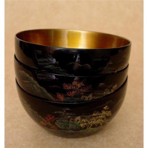 Set of three beautiful, fine vintage Japanese black and gold lacquer bowls decorated inside and outside. Date of manufacture unknown. In very good used condition as shown. Please ask questions, request additional photos and shipping costs before buying.