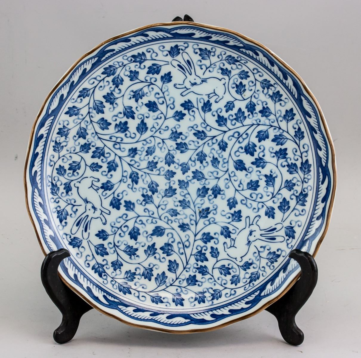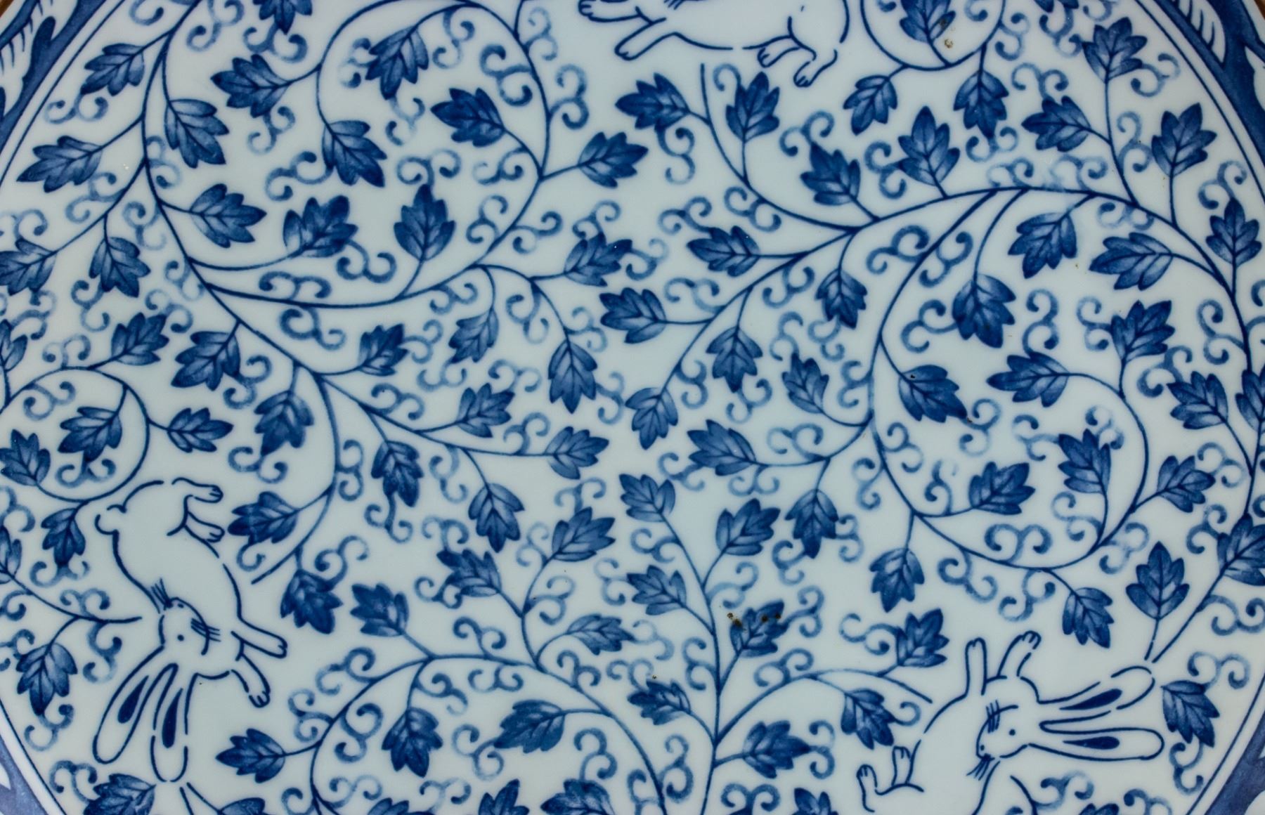Japanese blue and white porcelain plate. Of ripple edge. Featuring rabbit and flower motif. Three-character Kiyosu mark. 3 x 27.5 cm, 811 grams