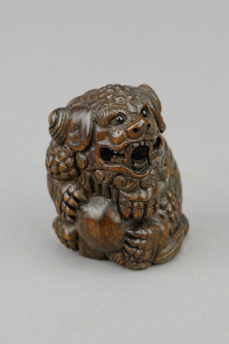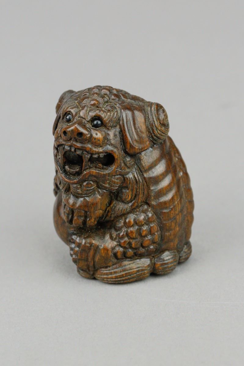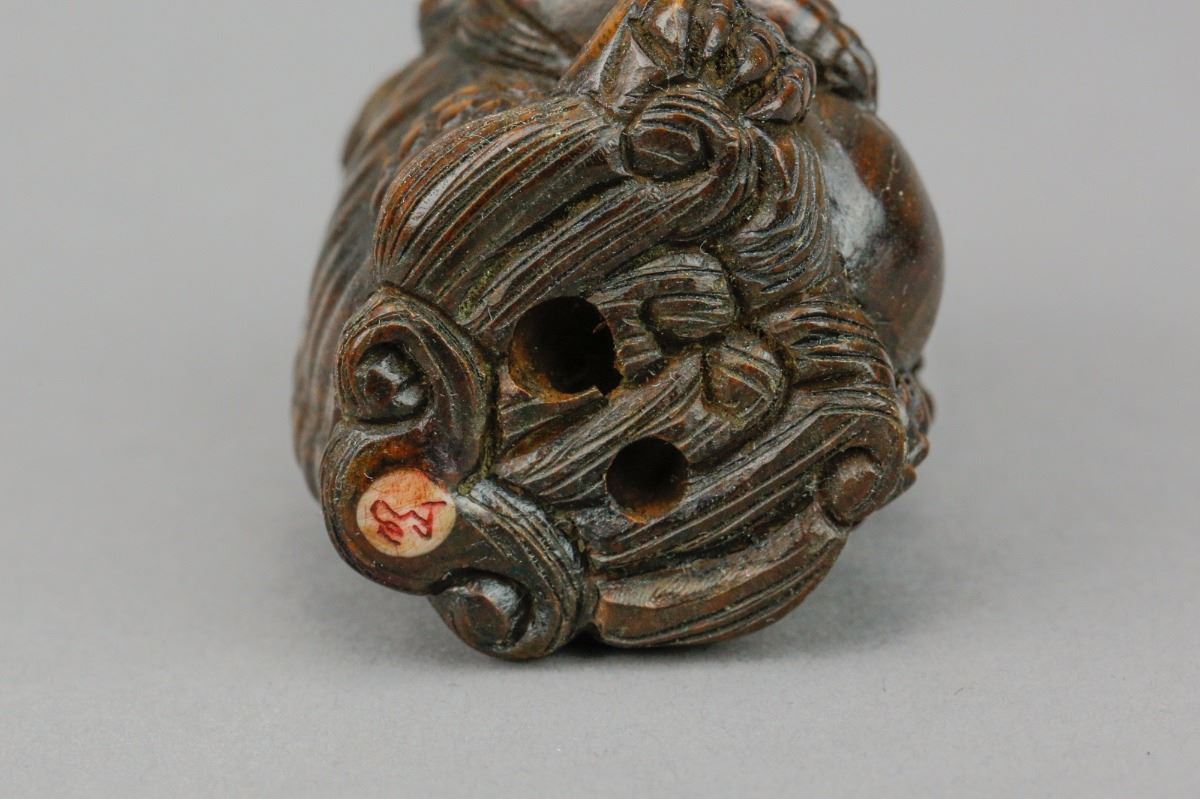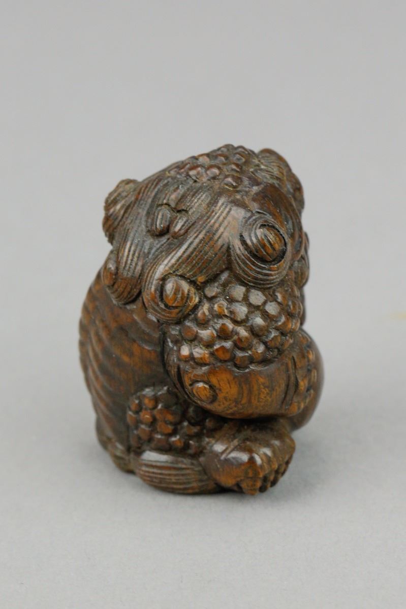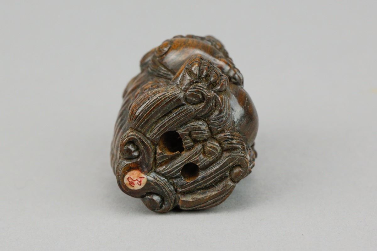 Japanese boxwood netsuke; featuring Japanese folk creature; artist signature on base; 19th century; pierced for suspension; H: 5.5 cm, W: 3 cm, 20 grams