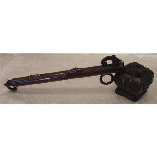 Japanese bronze brush holder and water pot. When you open the lid to the water area, the area to put the ink brush for calligraphy is also opened. Foo dogs or foo lions in relief decorate the 4 sides of the water pot while a scholar is on the top. This brush holder measures approximately 13 1/2" in length. It is in excellent antique condition.