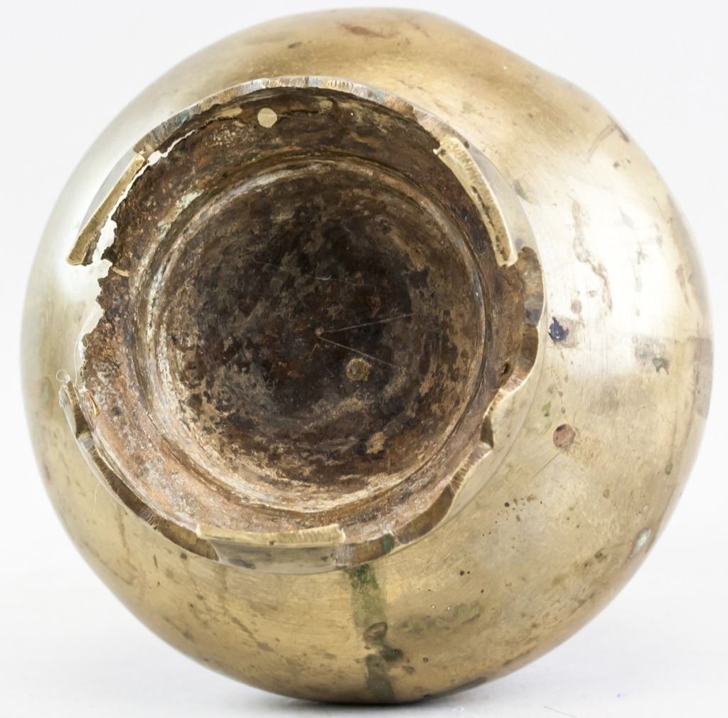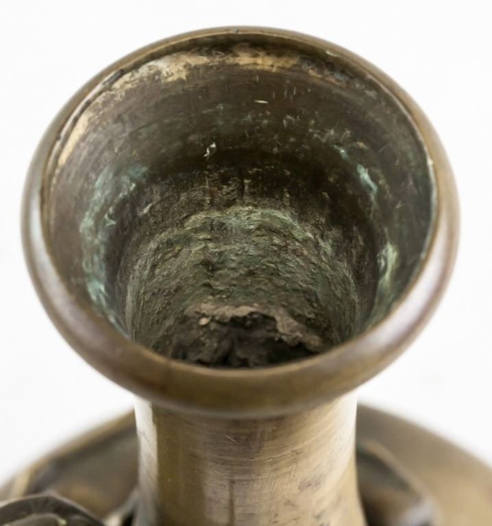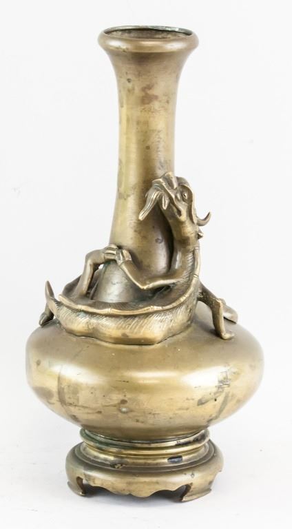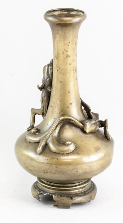 Japanese bronze vase. With dragon curled around the neck. With round rim and tall narrow neck, flaring to flat spherical body, resting on foot rim. Some damage to the base. 19th century or later. 26 x 14 cm. 1,404 grams.