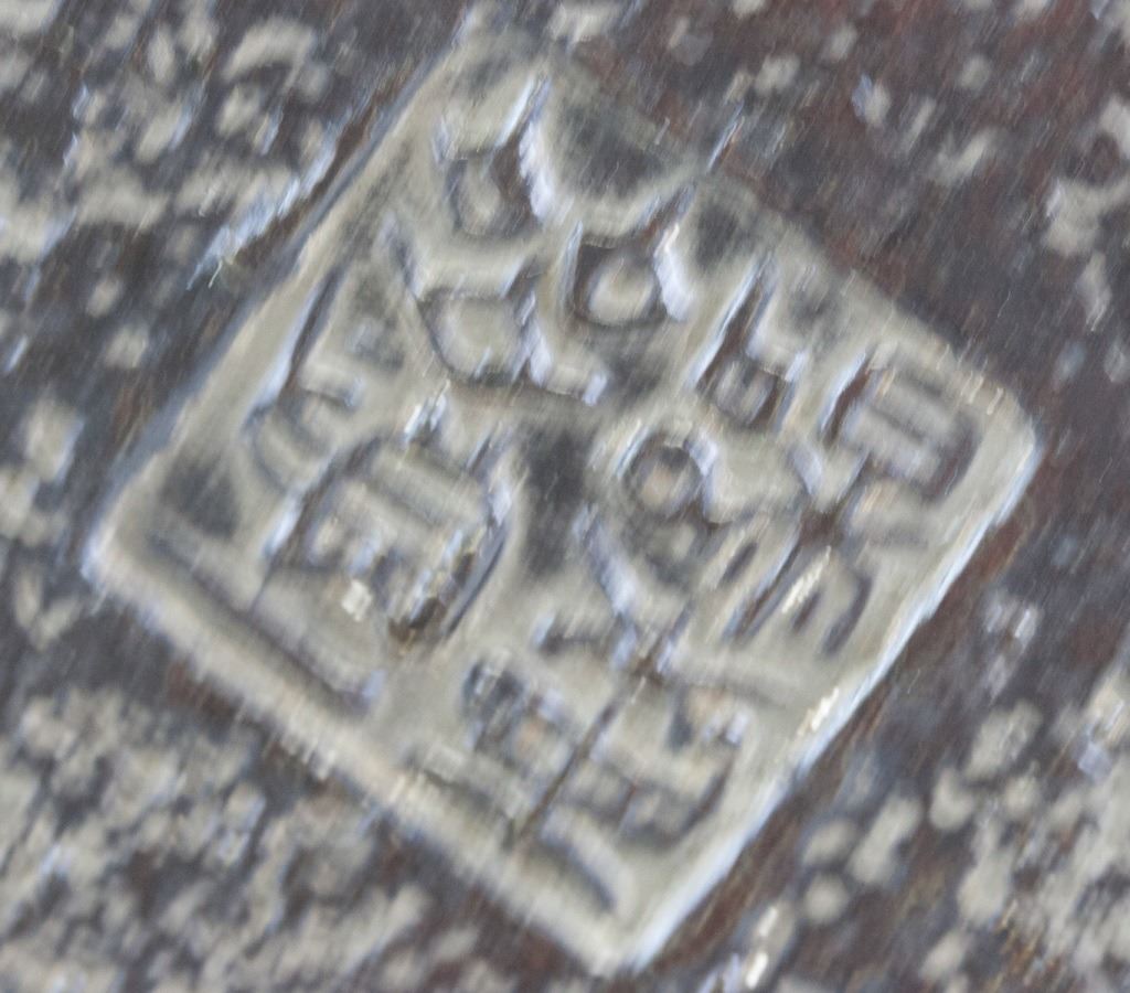 Japanese bronze incense burner. Of brown tone with gold-colored rim. Of square shape with two rounded handles on two corners. Carved with wave-like patterns. Mark on base. 12 x 29.5 cm, 1775 grams.