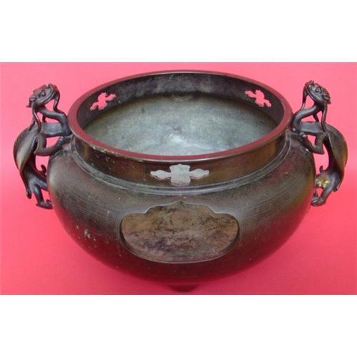Footed Japanese bronze usubata ikebana with dragon handles <p> Age: Meiji, 1900-1920 <p> Measurements: 16 1/2" by 12 1/2" by 8" high <p> Condition: Good, You can see where the dragons have been attached and one dragon has a broken tail.
