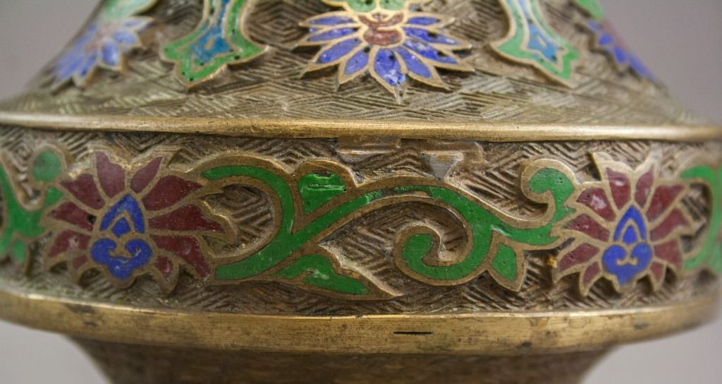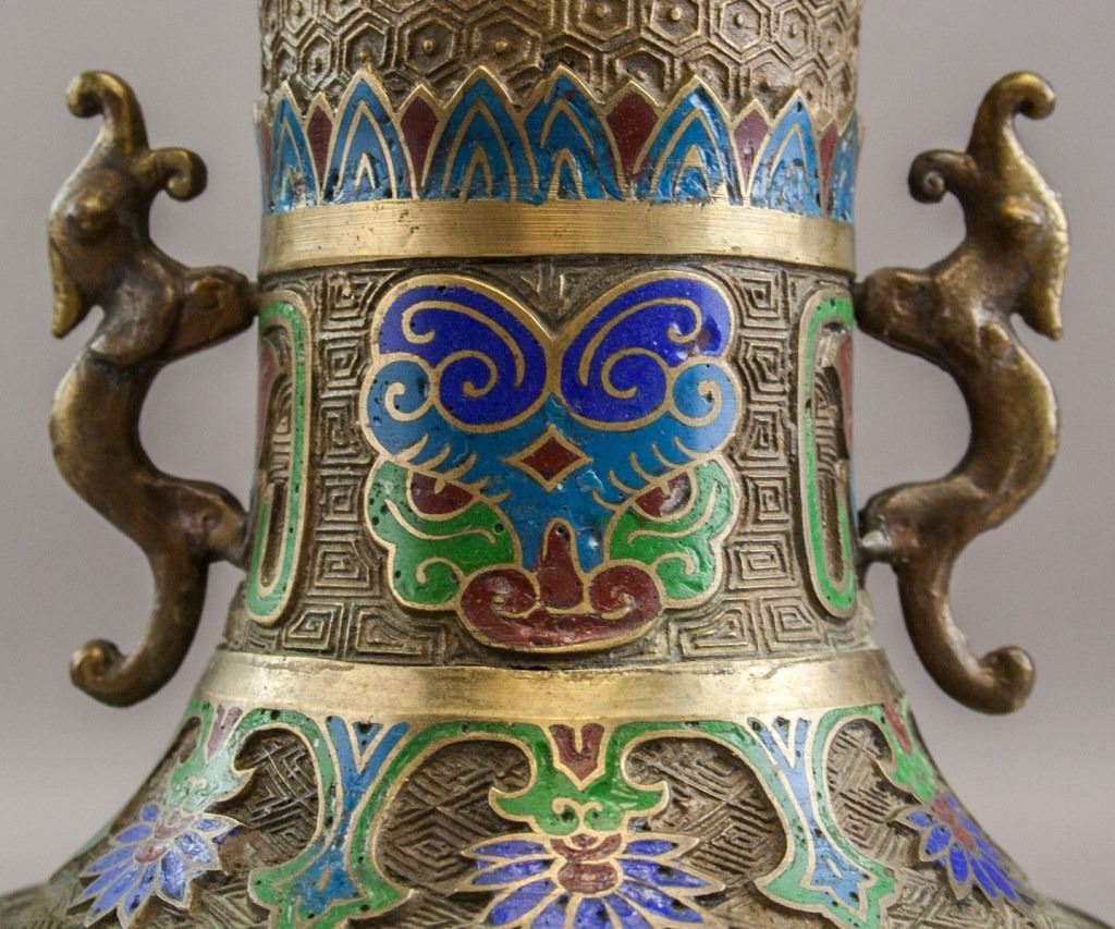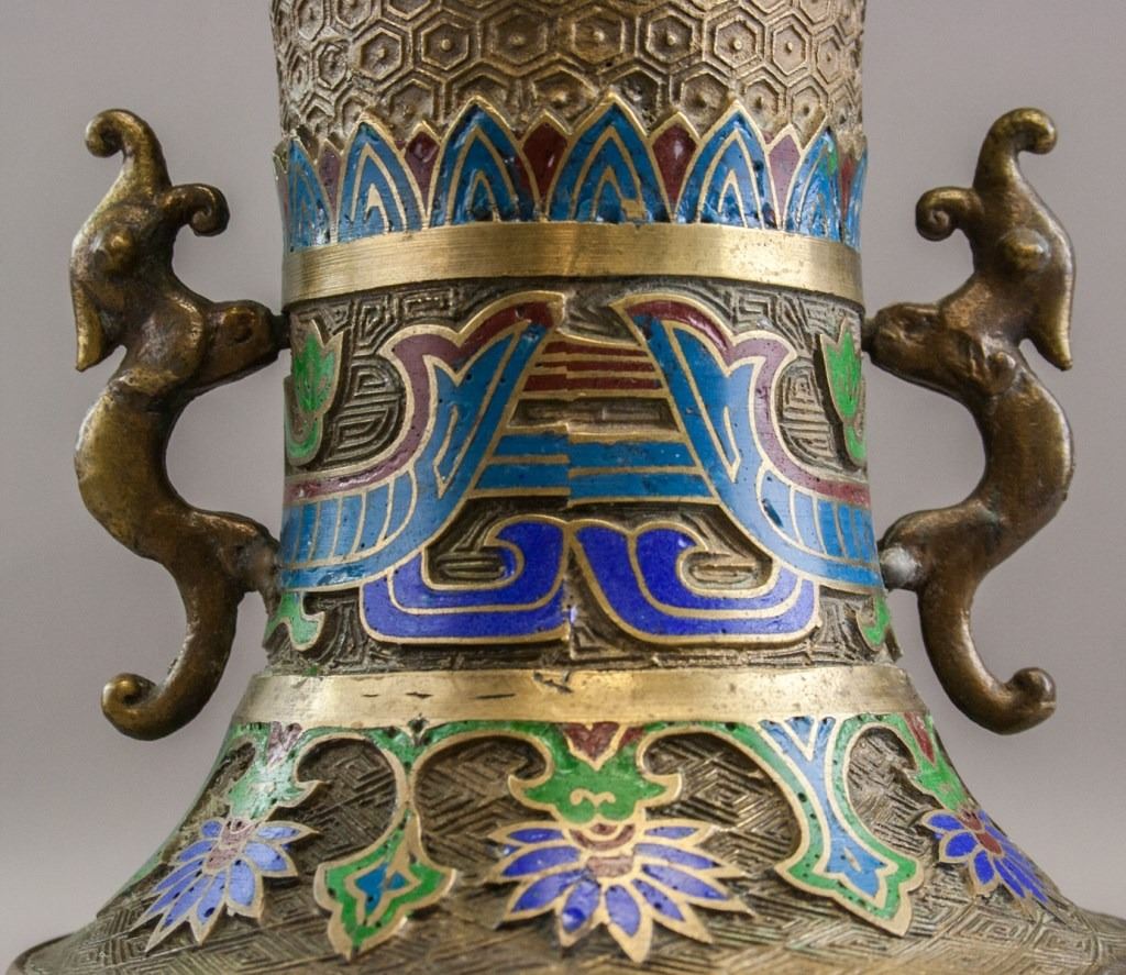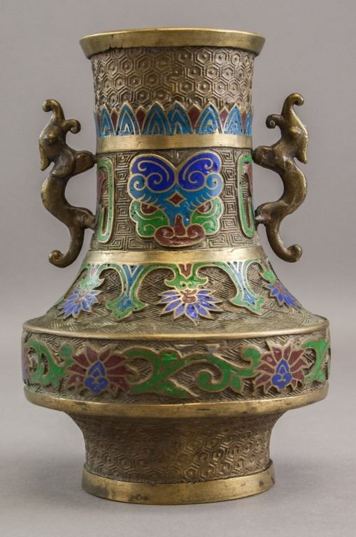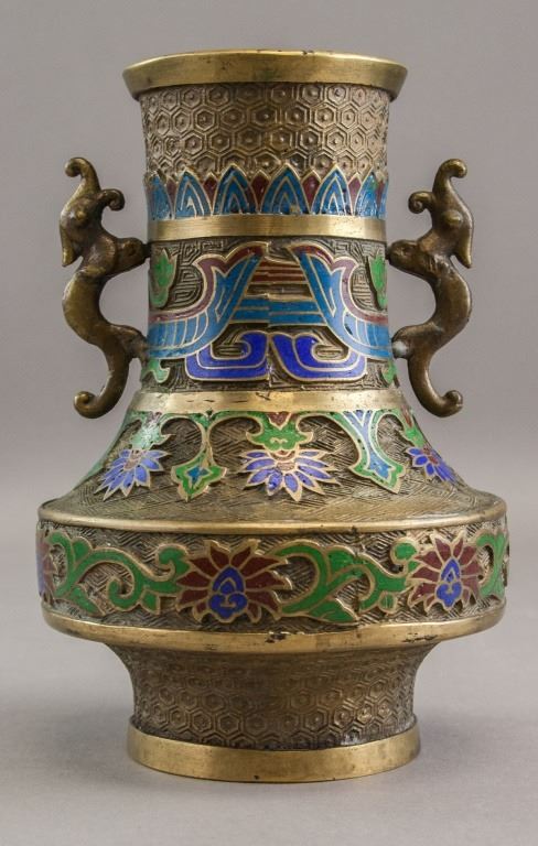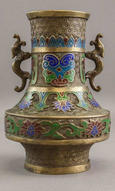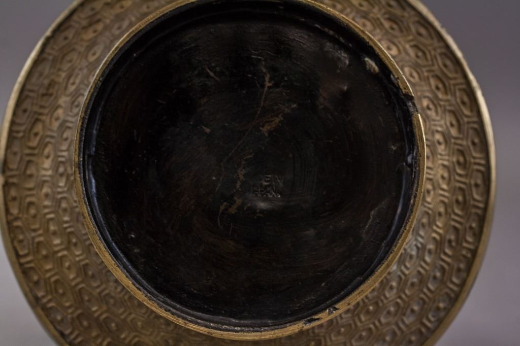 Japanese bronze vase. With wide cylindrical neck, flat circular body, resting on tall cylindrical foot. With two beast shaped handles on the neck. 22 x 14 cm. 1,164 grams.