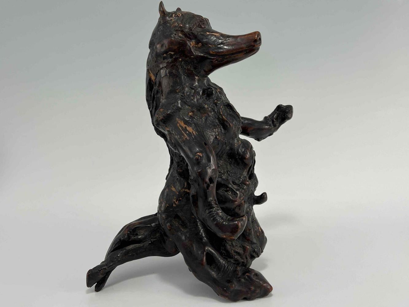 Japanese Burl Wood Root Sculpture of a Kitsune with Hat and Sake Jug. Unmarked. Approximately 15.875H x 8.75W x 10.5D in.
