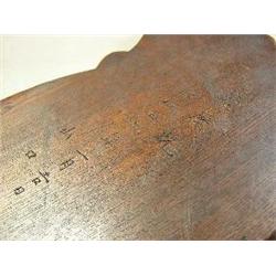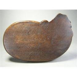A kidney shaped shallow wooden tray carved at one end with the cloaked head of Daruma used for the Sencha tea ceremony, engraved year "Showa 27th" and month "January" on the bottom in fine condition. Japan, Mid. 20th Centry. 37 cm x 25 cm. 14 3/5" (37 cm) x 9 7/8 (25 cm)