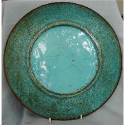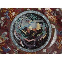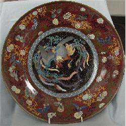 A large cloisonne charger with the central medallion decorated with a multi colored Phoenix bird surrounded by a red border filled with flowers and butterflies. Fine condition with some minor crazing to the base. Japan, Meiji Period. 12" (30.5 cm) Dia.