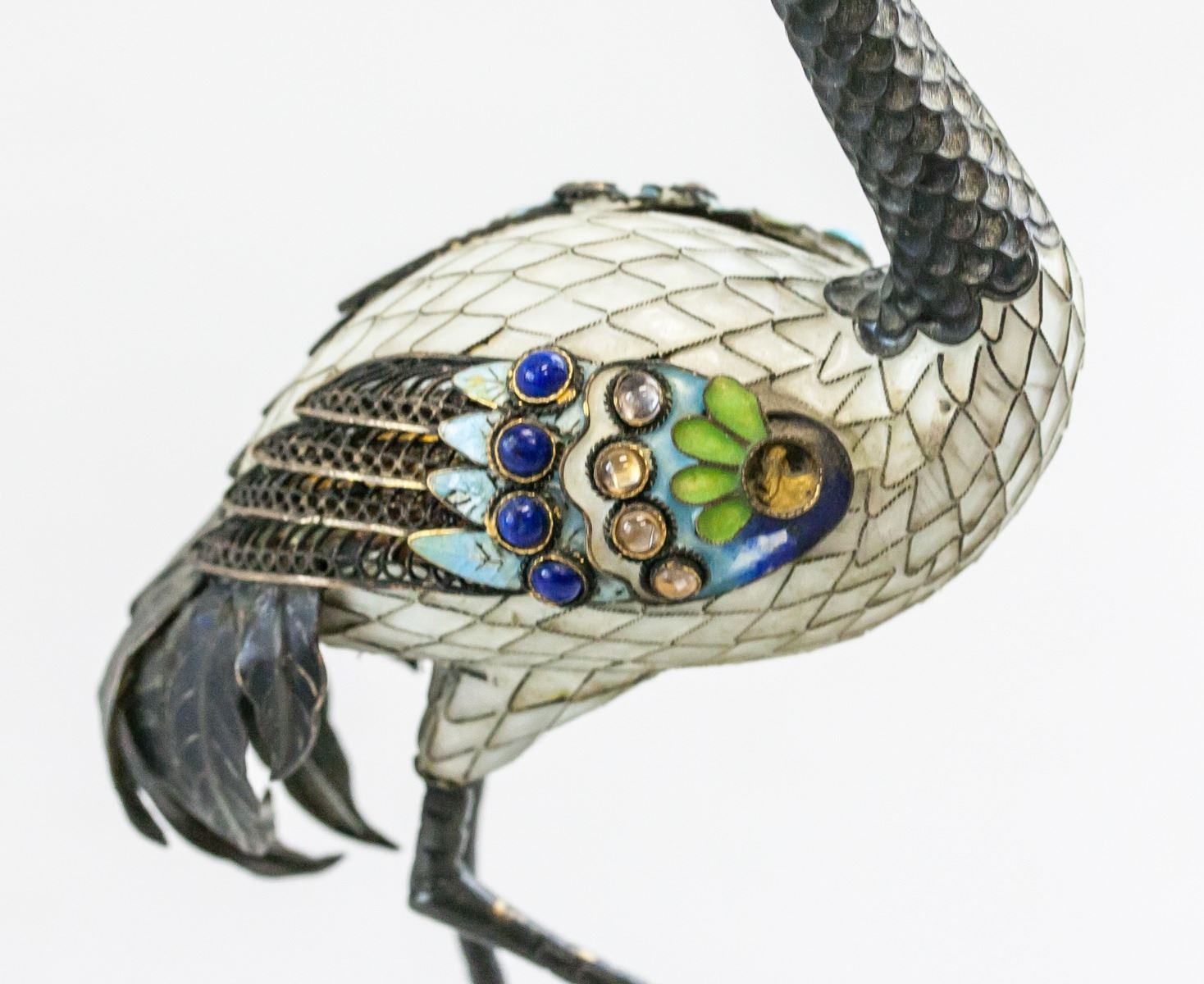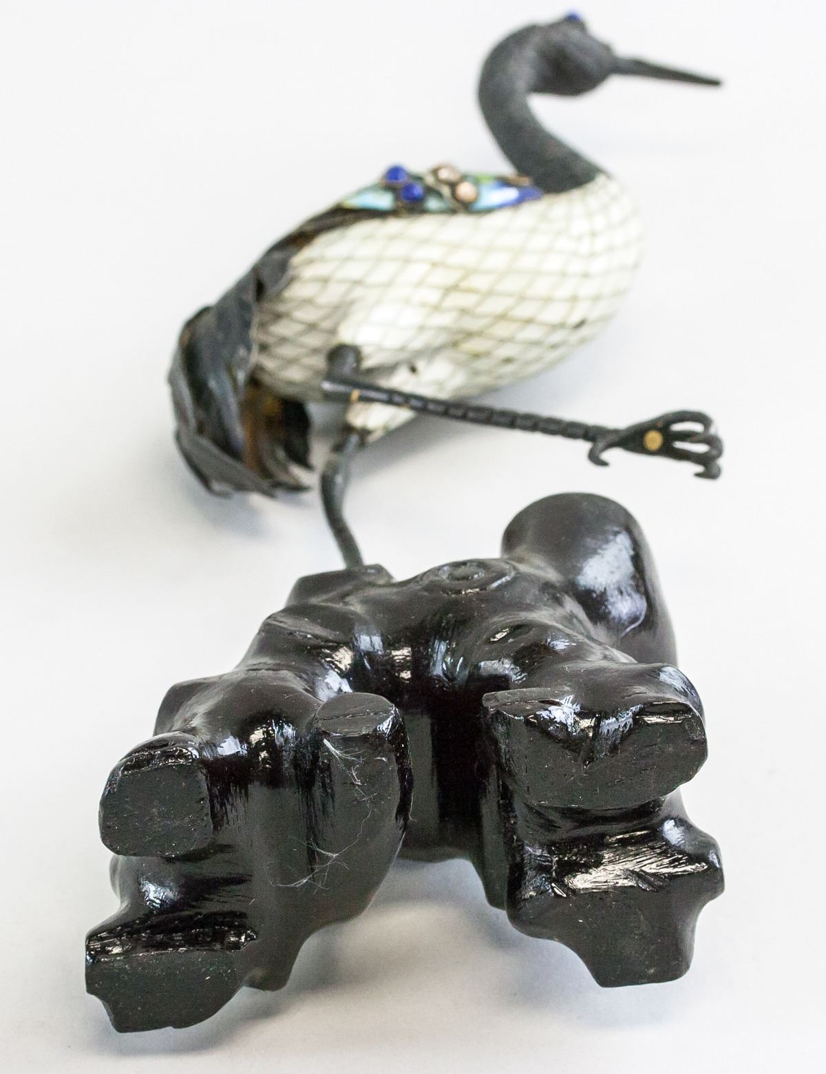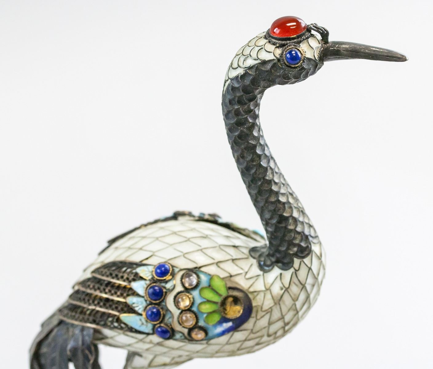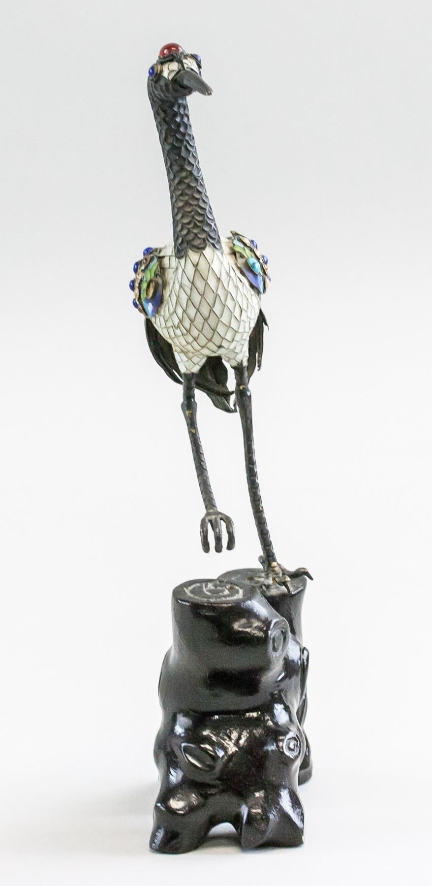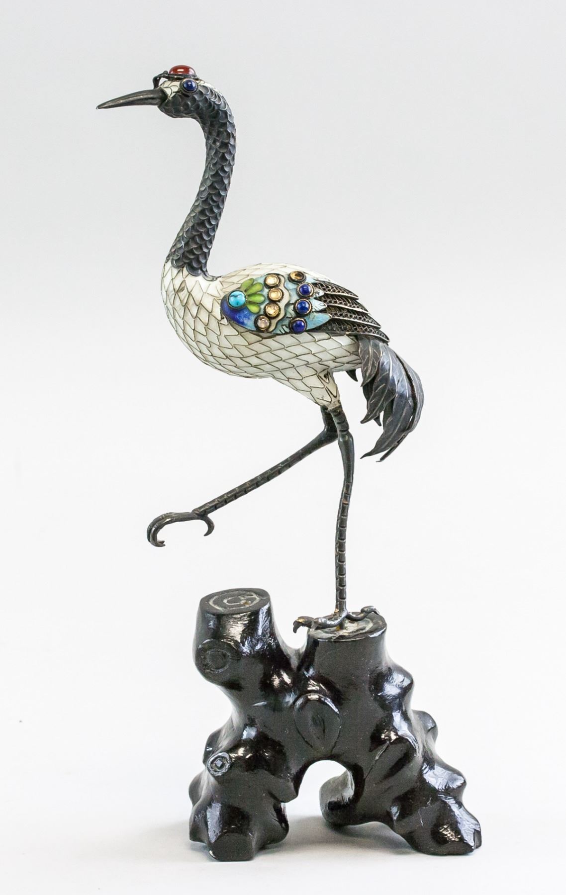 Japanese cloisonne crane on wooden stump. Jeweled stones set into wings and head. Crane standing on one leg. 27 x 11 cm, 210 grams.