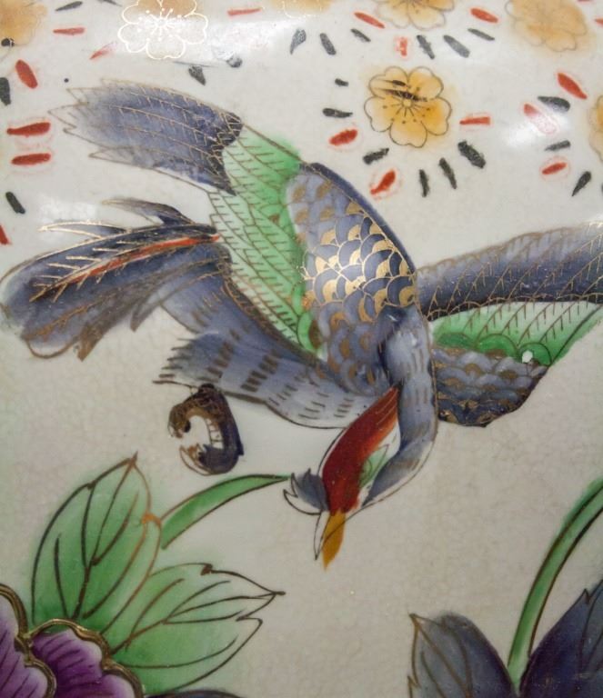 Japanese porcelain vase. With round overturned lip and two ears on the neck. Of oval shaped body. Painted with flowers. 127 x 43 cm.