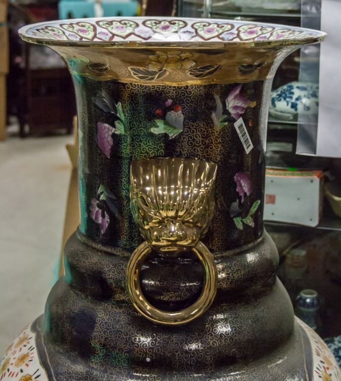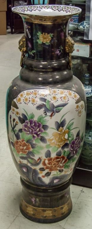 Japanese porcelain vase. With round overturned lip and two ears on the neck. Of oval shaped body. Painted with flowers. 127 x 43 cm.