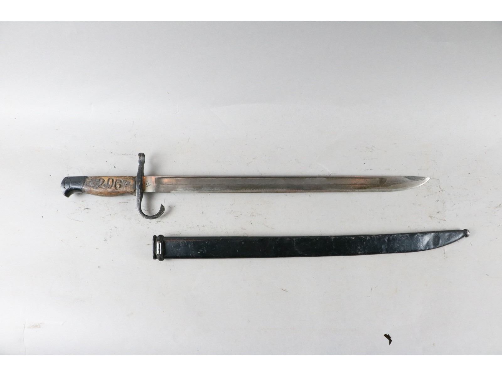 Tokyo arsenal. Rough sharpened blade. Hooked crossguard. Scabbard, crossguard, and pommel are all painted black. No 20+6 burned into 1 side of wood. School Kanji burned in other side. Combat bayonet turned into school trainer