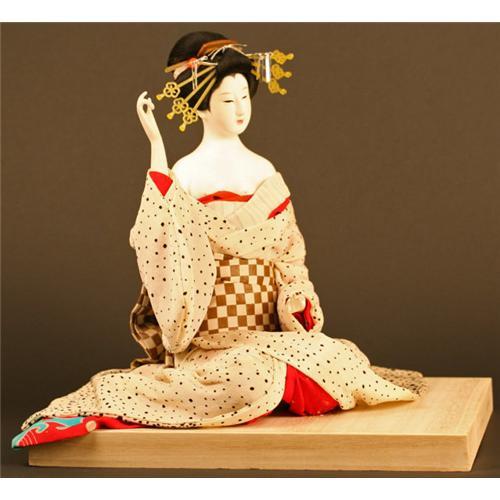 Japanese Isho Ningyo of an Oiran, the most important Geisha of the Kyoto Geisha quarter. The book and movie 'Memoirs of a Geisha' is the story of an Oiran. This master work is truly a work of art to behold, and is by one of Japan's foremost doll makers, the late Ito Hisashige XI. The first Ito Hisashige was appointed to the position of Court Doll Maker by Emperor Gosakuramachi in 1767. This long unbroken line has continued in this position, making some of Japan's finest Ningyo for 12 generations. This fine example was made in the 1940s. We have never seen an Oiran bearing her breasts, one of the many beautiful aspects of this very special Geisha Ningyo. 14 inches (35.5 cm) tall with 14 x 12 (35.5 x 30.5 cm) base. Excellent Condition.