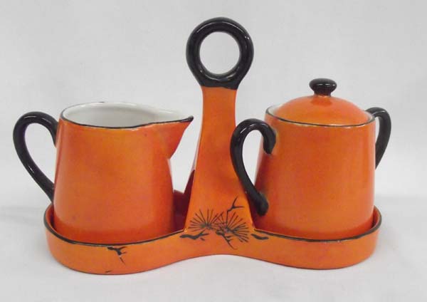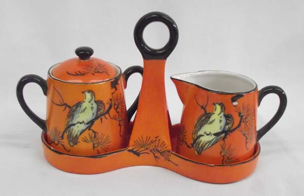 Japanese Creamer Sugar & Carrier. Orange, edged in black with bird design. Marked "Made in Japan". Measures approx. 4 3/4''H x 7''W. Buyers Pay Actual Shipping and Handling Charges(see terms and conditions for more information).