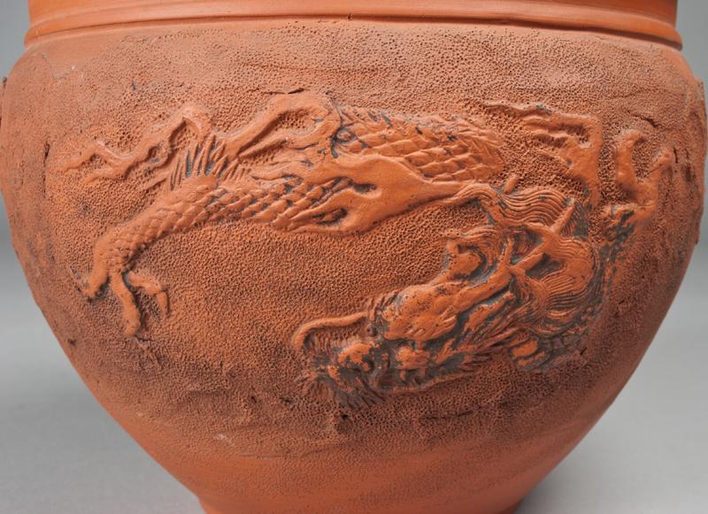 Finley molded to depict dragons, the rim with greek key fret, 9"D x 7.375"H, circa early 20th century.
