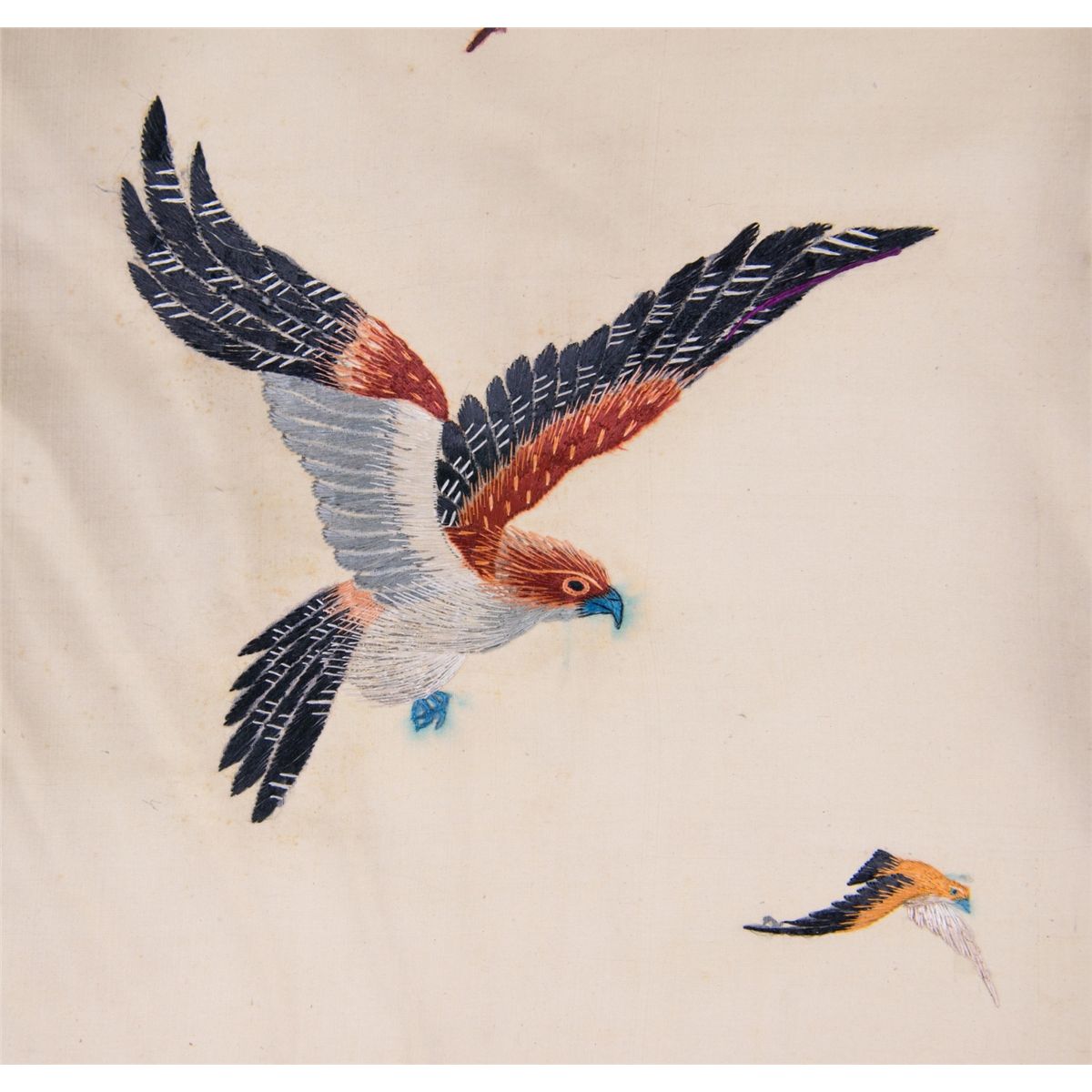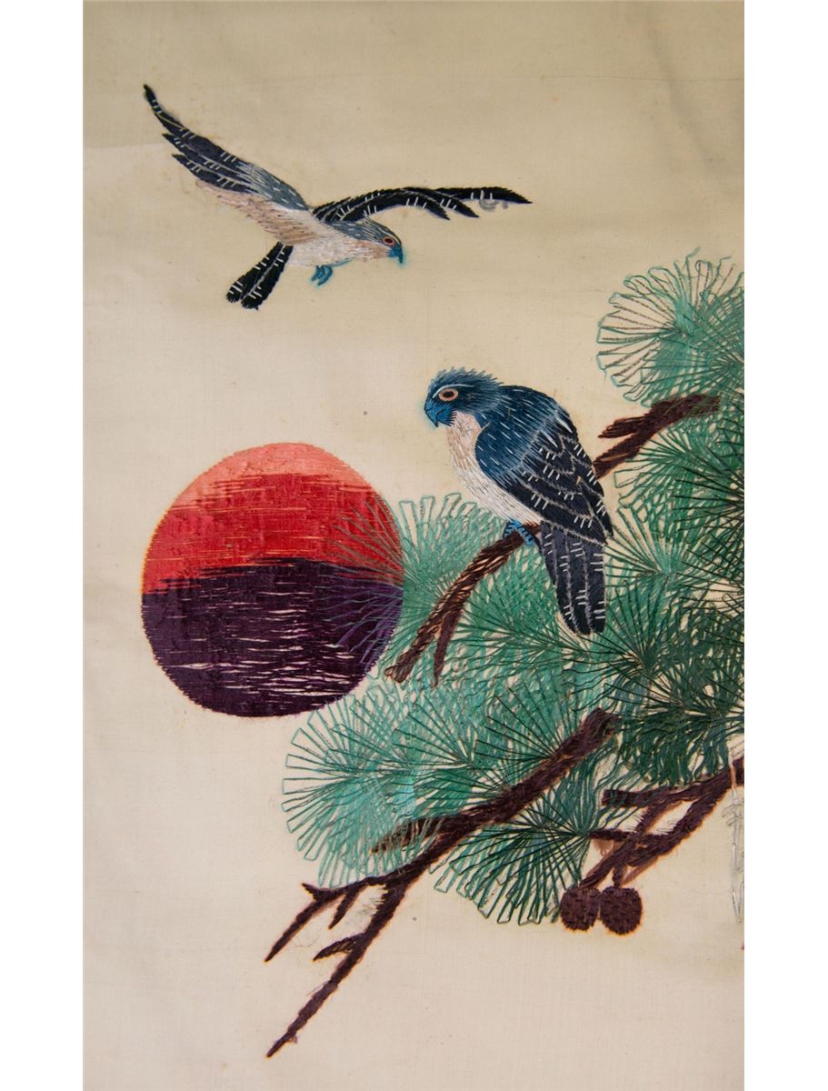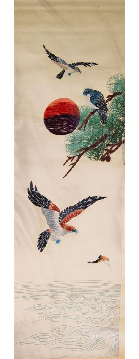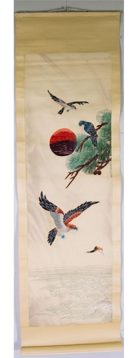 Japanese embroidery eagle scroll; hanging scroll; featuring eagles flying on waves and standing on pine tree branch; 130 cm x 31 cm