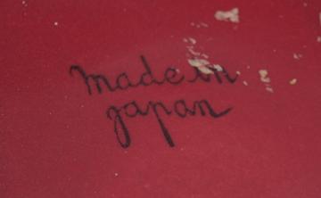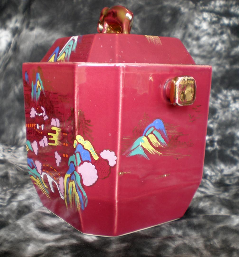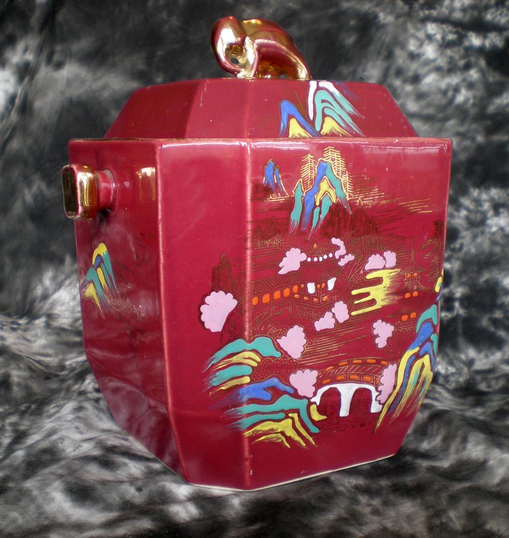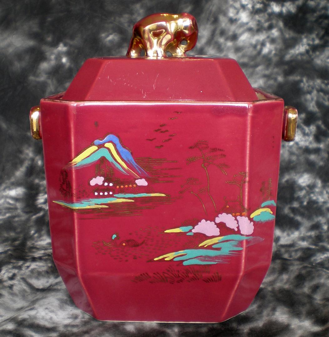 Japanese Enameled Biscuit Jar. Adorned with figural elephant finial. Gold decorations. 8.75" tall, 6.25" wide. Marked "Made in Japan".