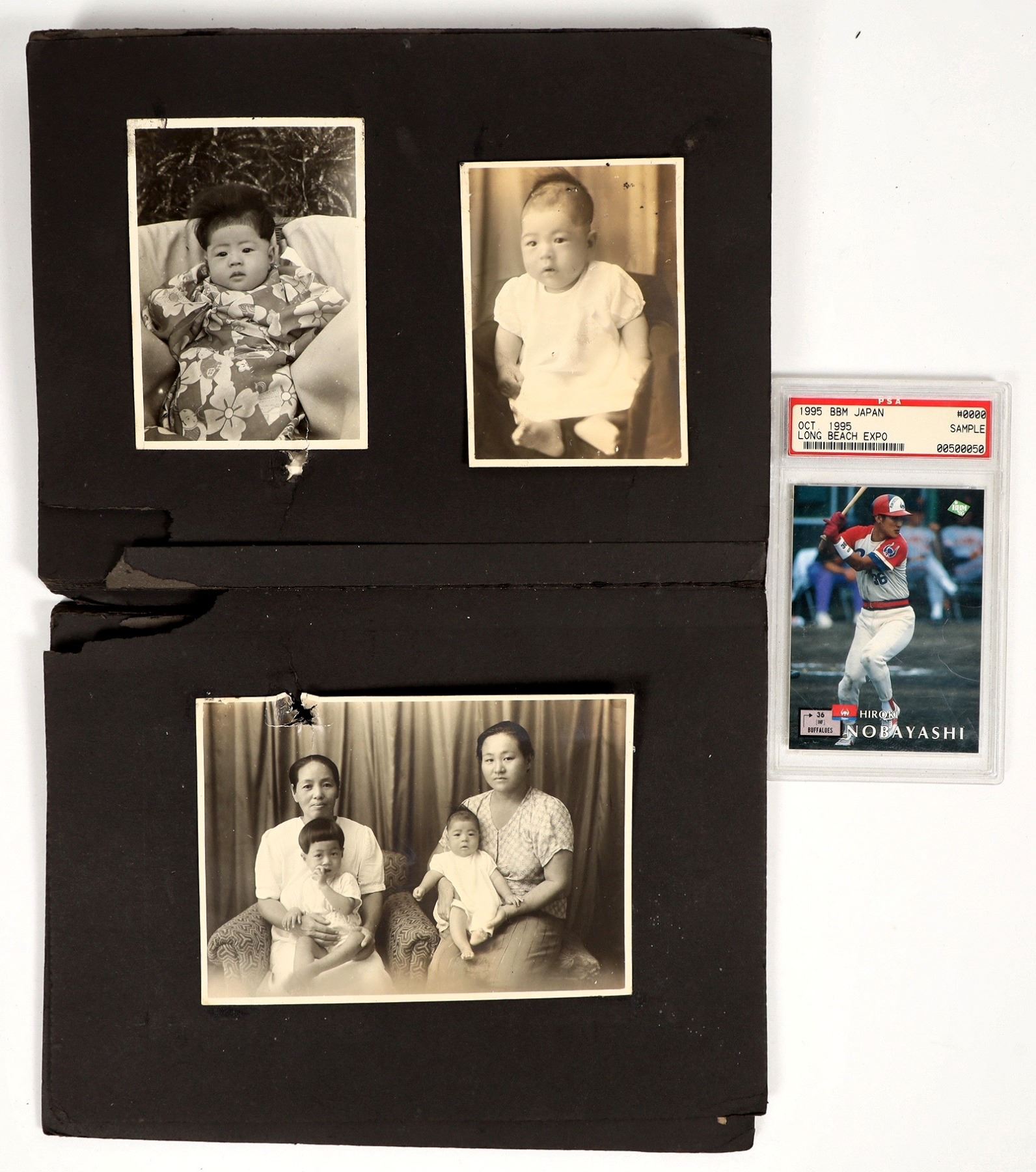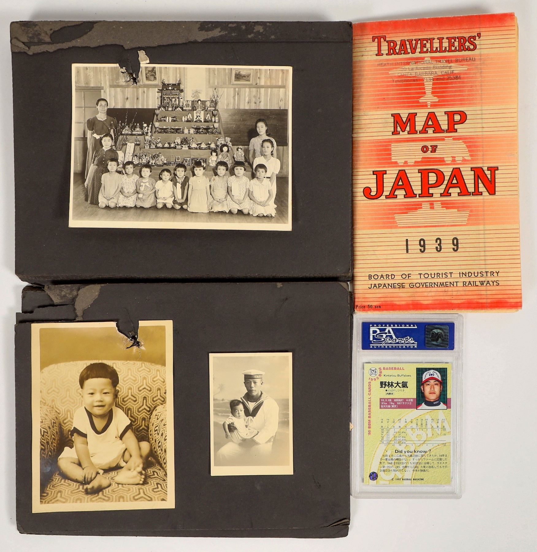 Lot of 3. 1, Personal photo album w/various family photos, military and children grade school graduations. Photos in tact, album is in poor cond. 2. 1939 pocket map of Japan and surrounding countries. VG cond. 3. Japan baseball collector card of Hiroki Nobayashi, 1995 Long Beach Expo. in plastic sealed holder.