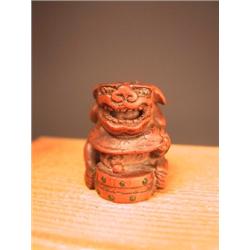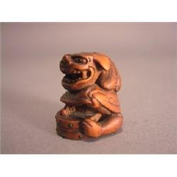 A carved figure of a seated man visible through the mouth of the shishi mouth on his shoulder playing a drum decorated with green crystals with his male anatomy. Fine condition with some wear to one ear. Signed "Miwa" Japan, Meiji Period. 1 1/4" (3 cm) H.