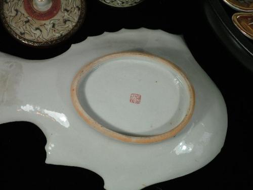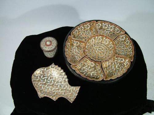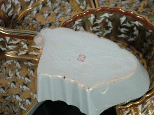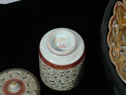 Japanese Export with seven dish rotational server, one container and one fish plate, gilt porcelain, mark verso, 4" by 14, 4" by 3 1/2", 9 1/2" by 7.