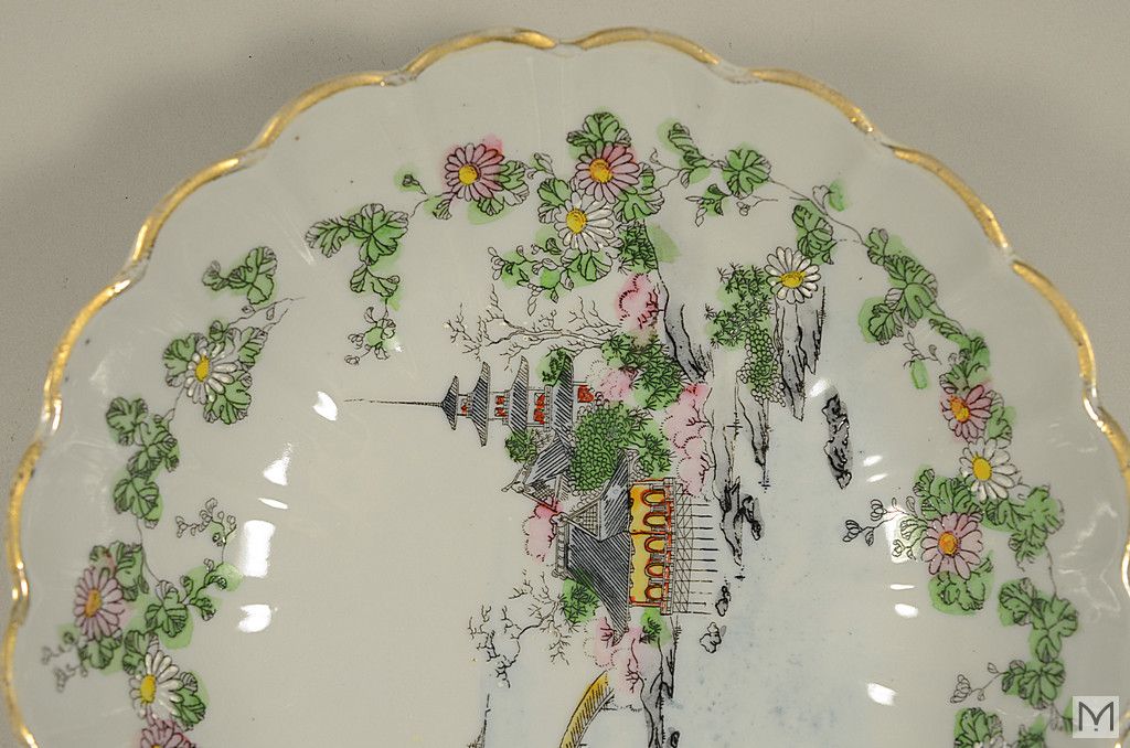 Japanese Export Ware Bowl - Pagoda, Buildings and Gardens -- CONDITION: Very fine antique condition - very minor wear to gilding at rim. -- Diameter: 8 3/4" inches -- Height: 2 1/2" inches -- Weight: 456 grams (note: item weight only - does not include packaging!)