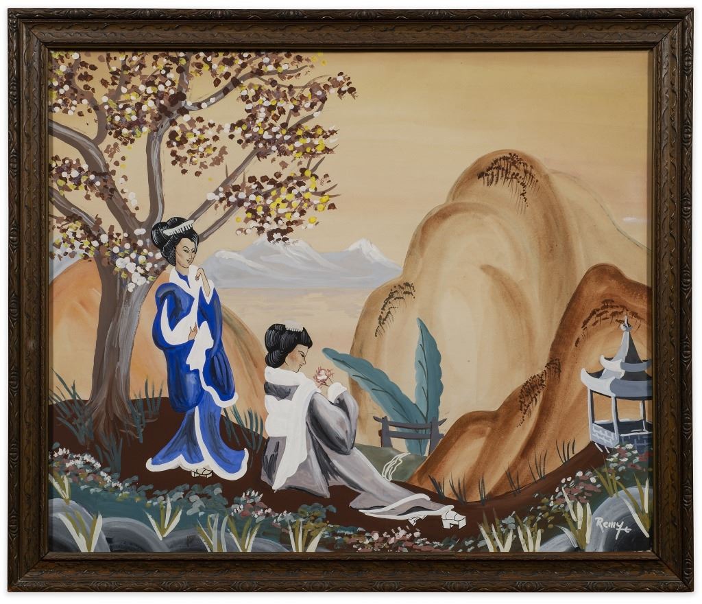 Item/Description: Landscape scene features two women near a cherry blossom tree, over looking mountains and a pagoda. Signed lower right, Remy.