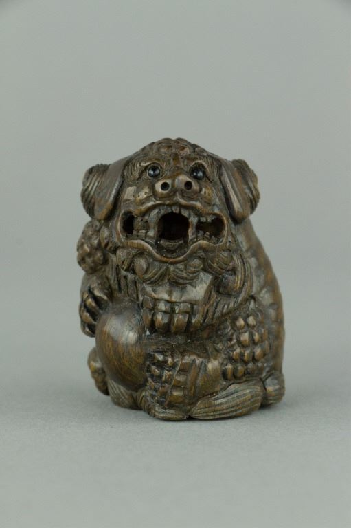 Fine Japanese boxwood netsuke; carved in form of Fu lion with paws on an embroidered ball; artist signature on base; H: 4 cm, W: 3 cm, 31 grams