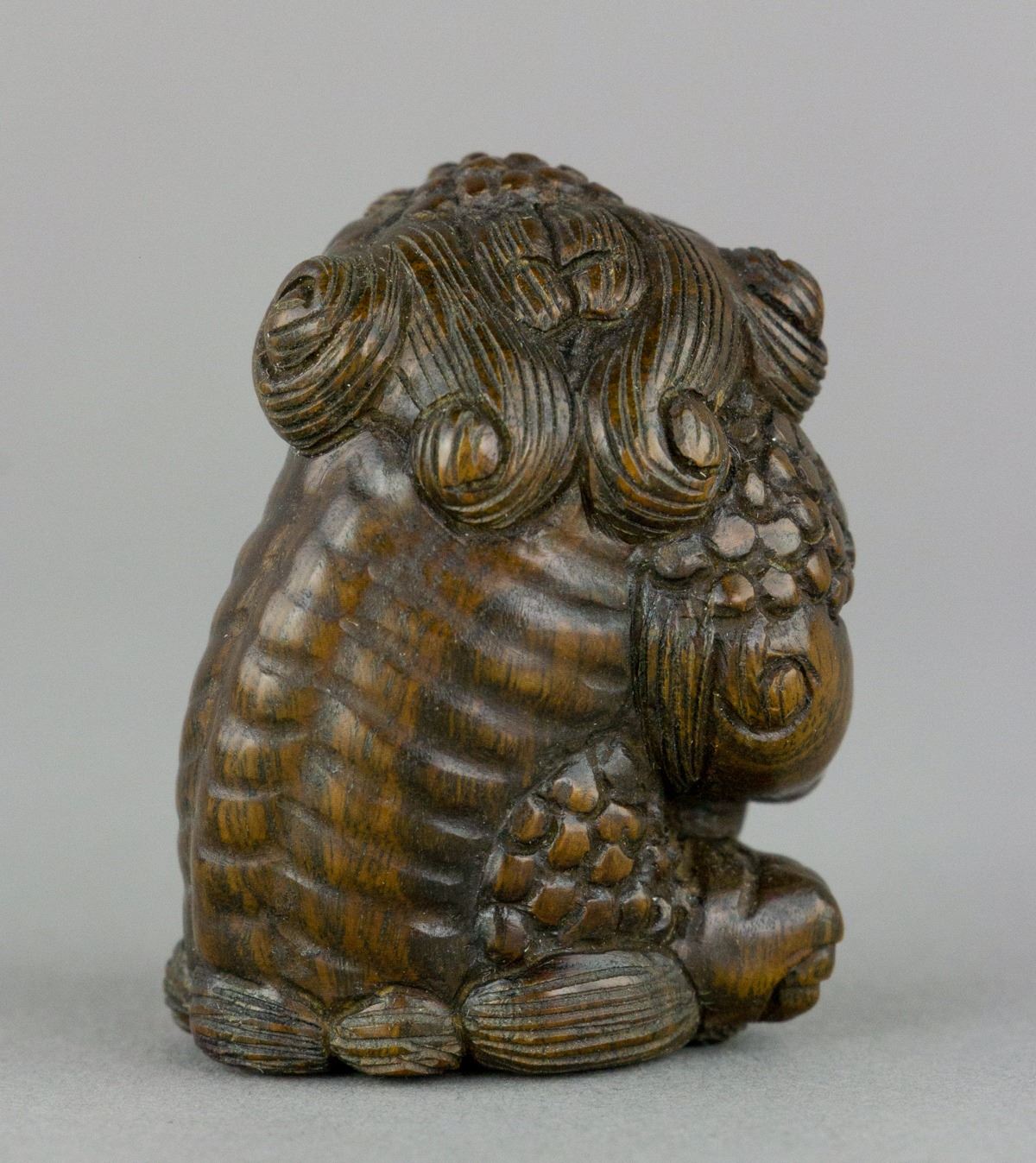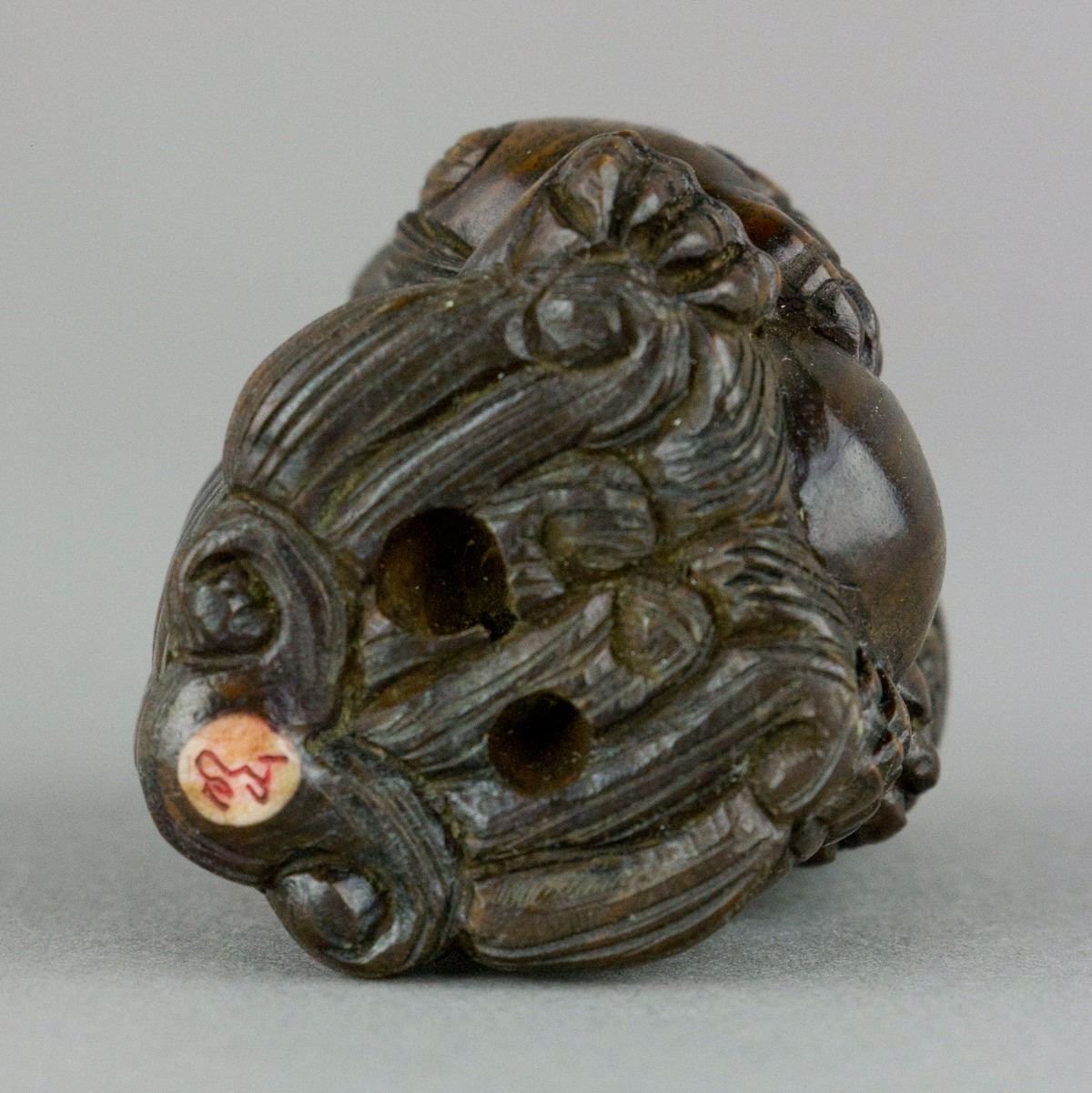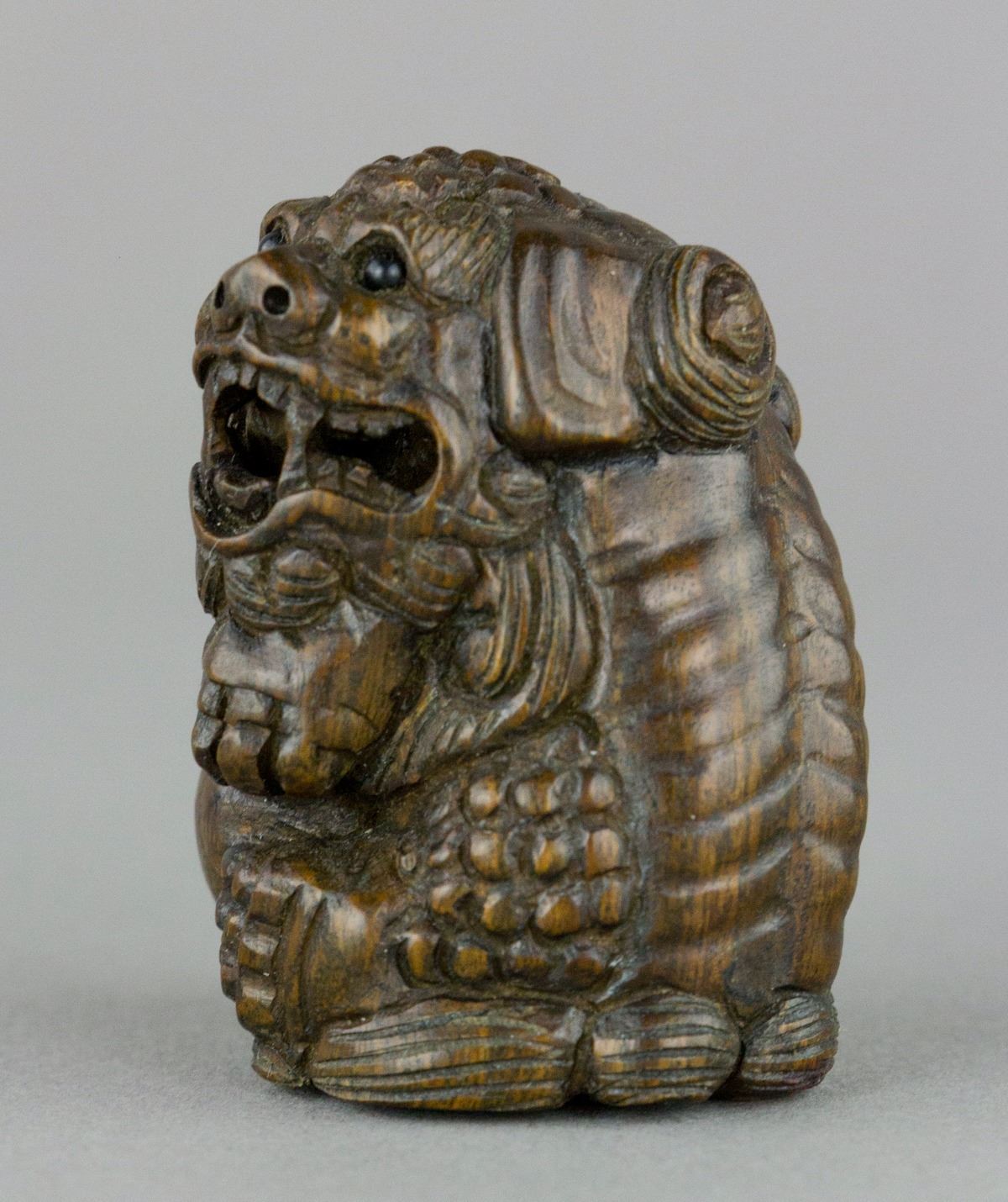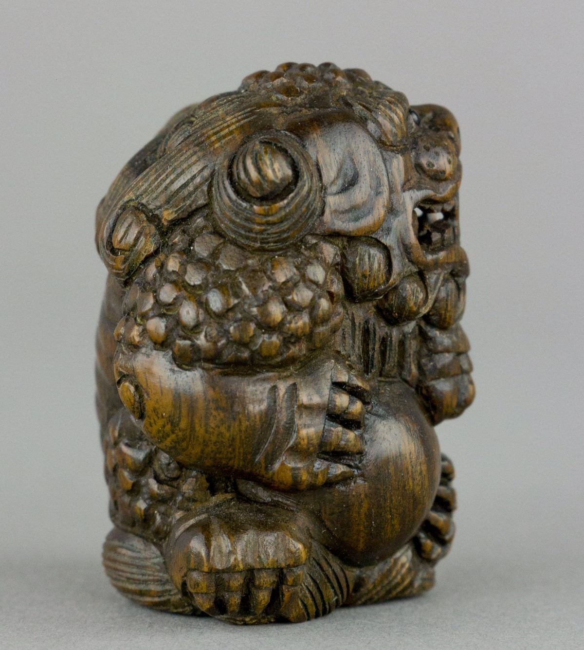 Fine Japanese boxwood netsuke; carved in form of Fu lion with paws on an embroidered ball; artist signature on base; H: 4 cm, W: 3 cm, 31 grams