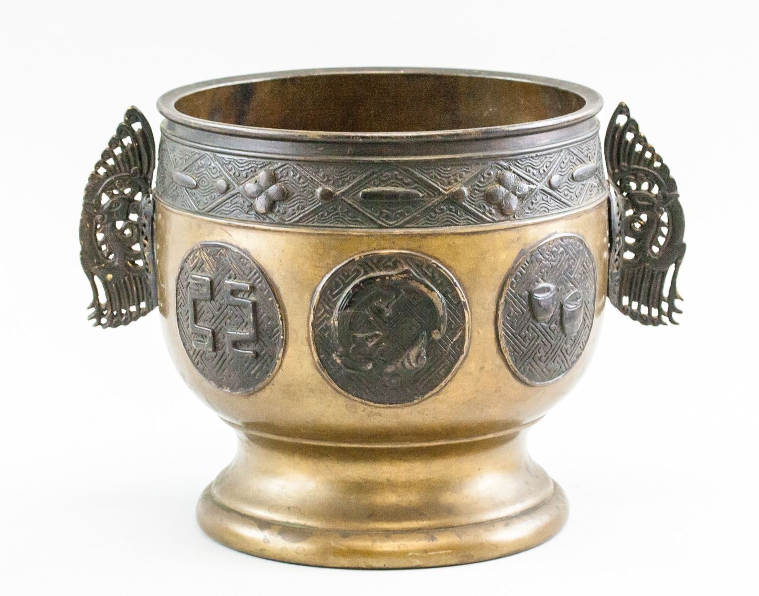Japanese porcelain bowl. Of brown and gold tone. With wing-like handles. Decorated with geometric motifs. Seal on base. 17 x 18 cm, 1611 grams.