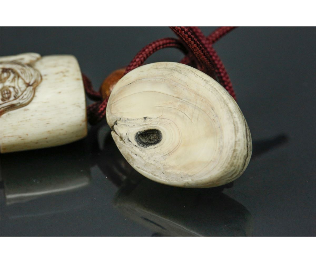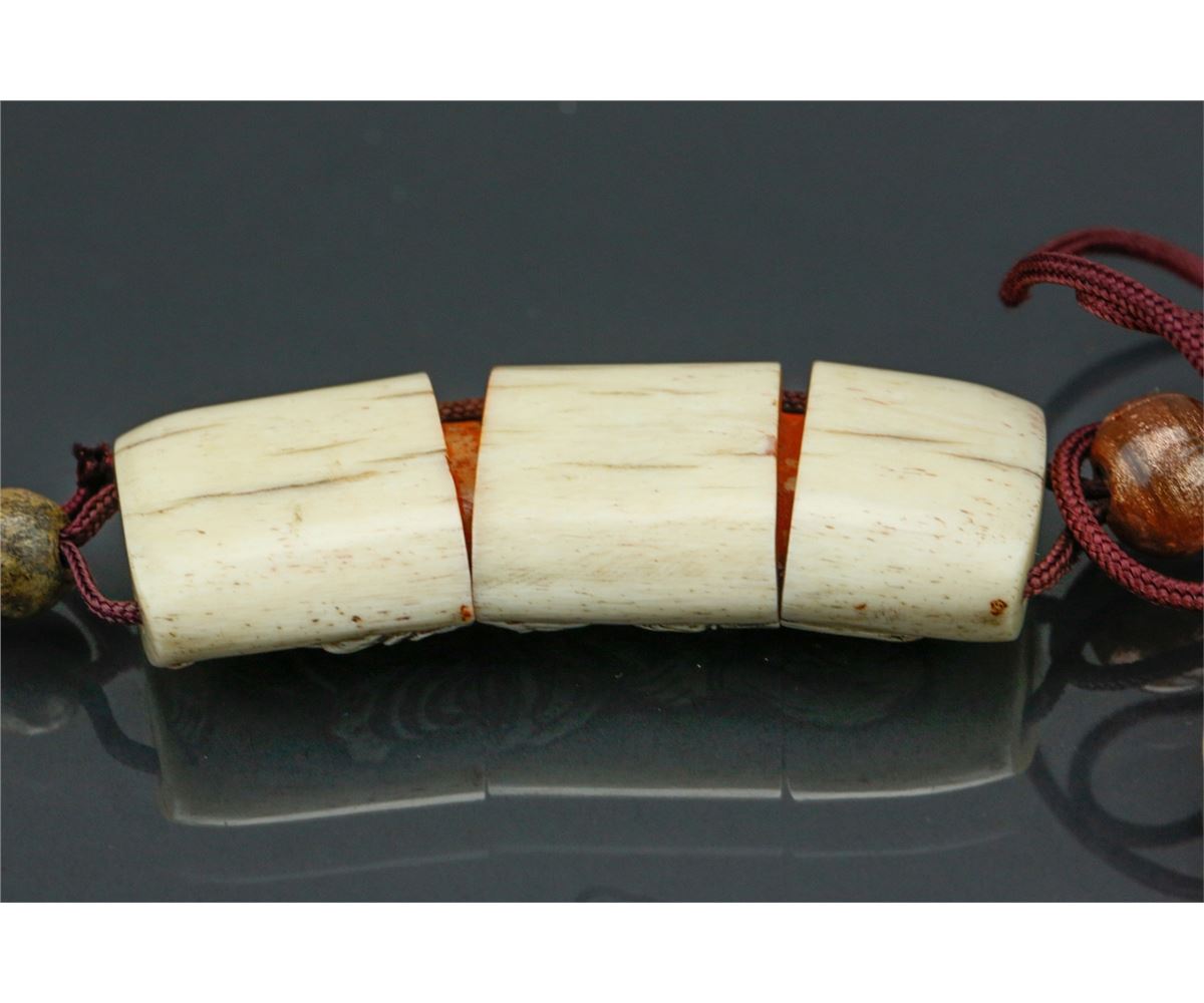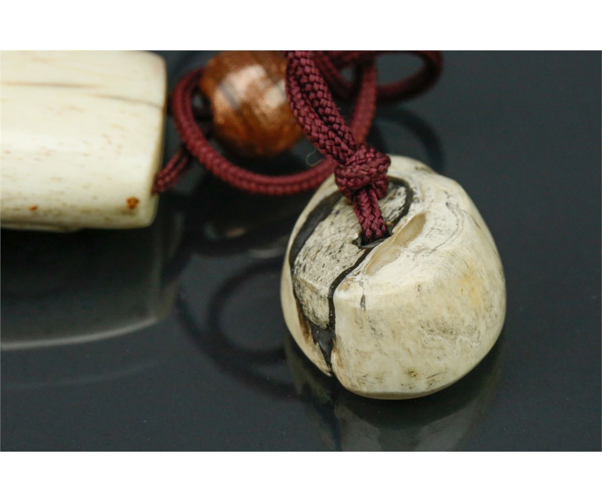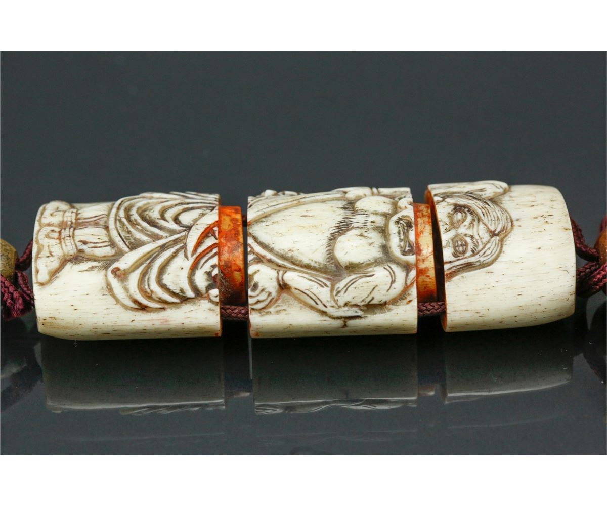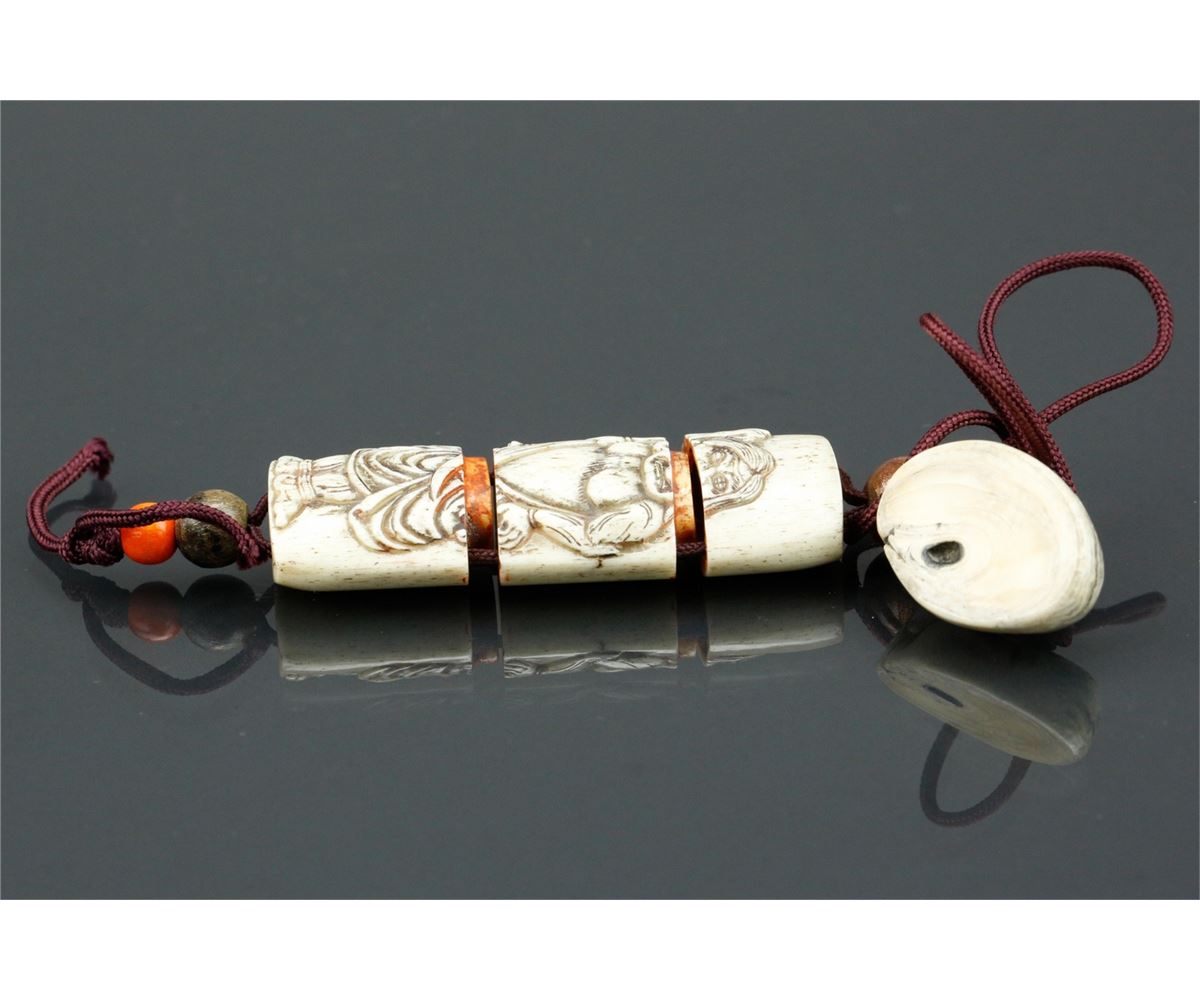 Japanese carved ivory inro; comprised of three components with Japanese folk creature carvings and an ivory ojime piece at the end of the cord; H: 8 cm, W: 3 cm, 40 grams