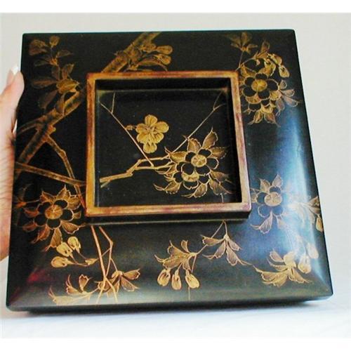 A fine black lacquer, with red interior on wood covered box, possibly a sweetmeat container. Beautiful delicate cherry blossoms and branches motif, lots of interesting details and style to this elegant box. Condition very good, a surface age crack on base. Otherwise, condition is excellent<p> Dimensions; 9"(22.50cm)square. 4"(10cm) height