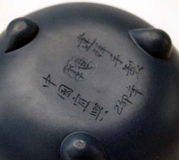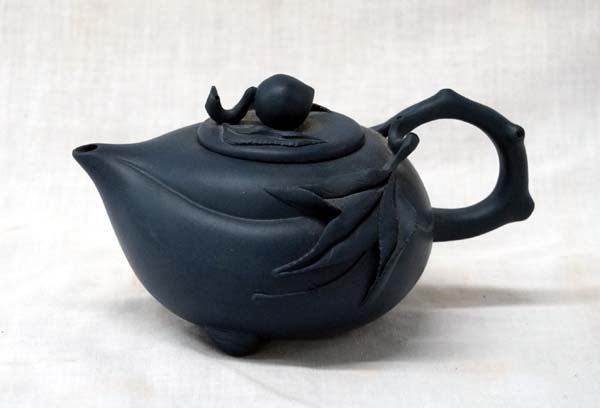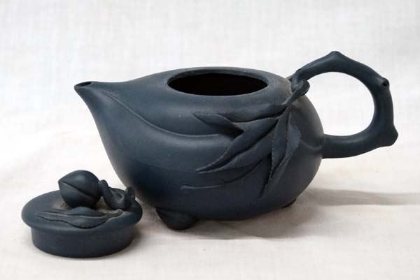 Japanese Fine Porcelain Tea Pot, measure 3'' x 6'', beautiful deep blue green color, lovely peach motif, signed on the bottom in Japanese characters