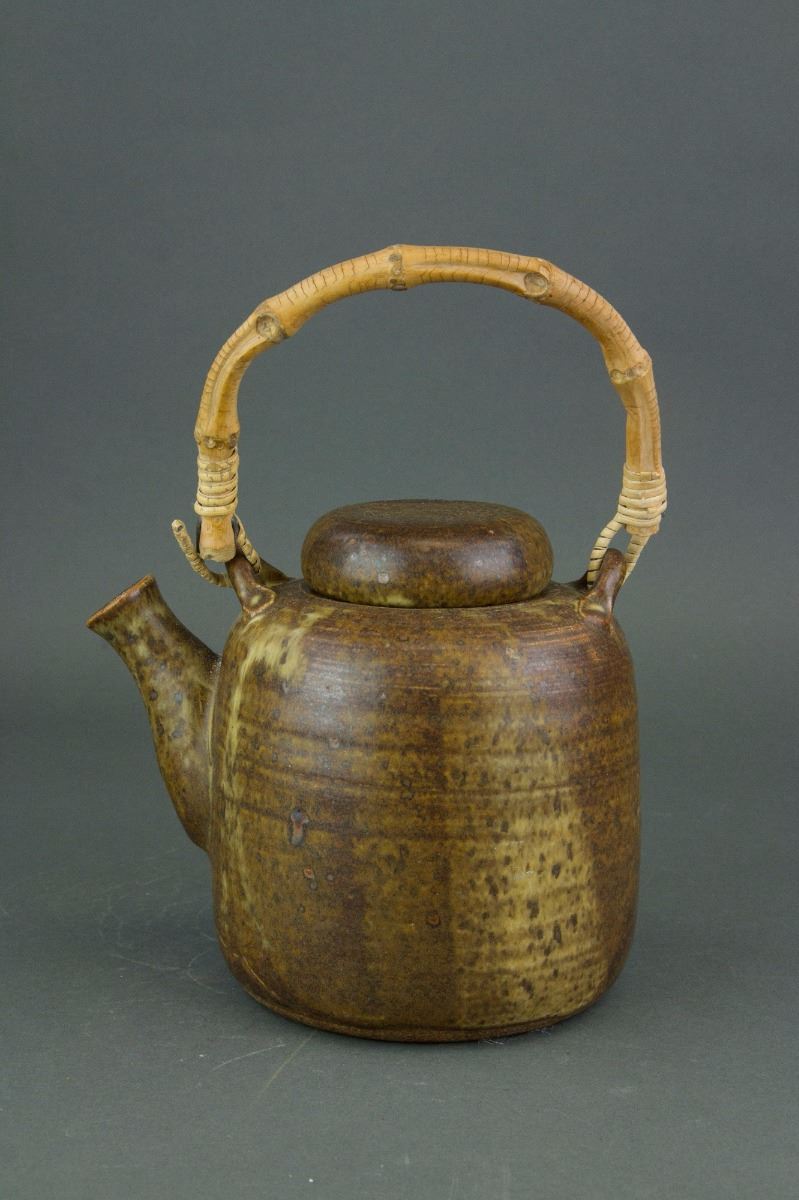 Japanese fine stoneware teapot; of barrel-shaped body set with a short spout and a bamboo swing handle; the base incised with Vice Steven's mark; H: 25 cm, W: 16 cm, 1383 grams