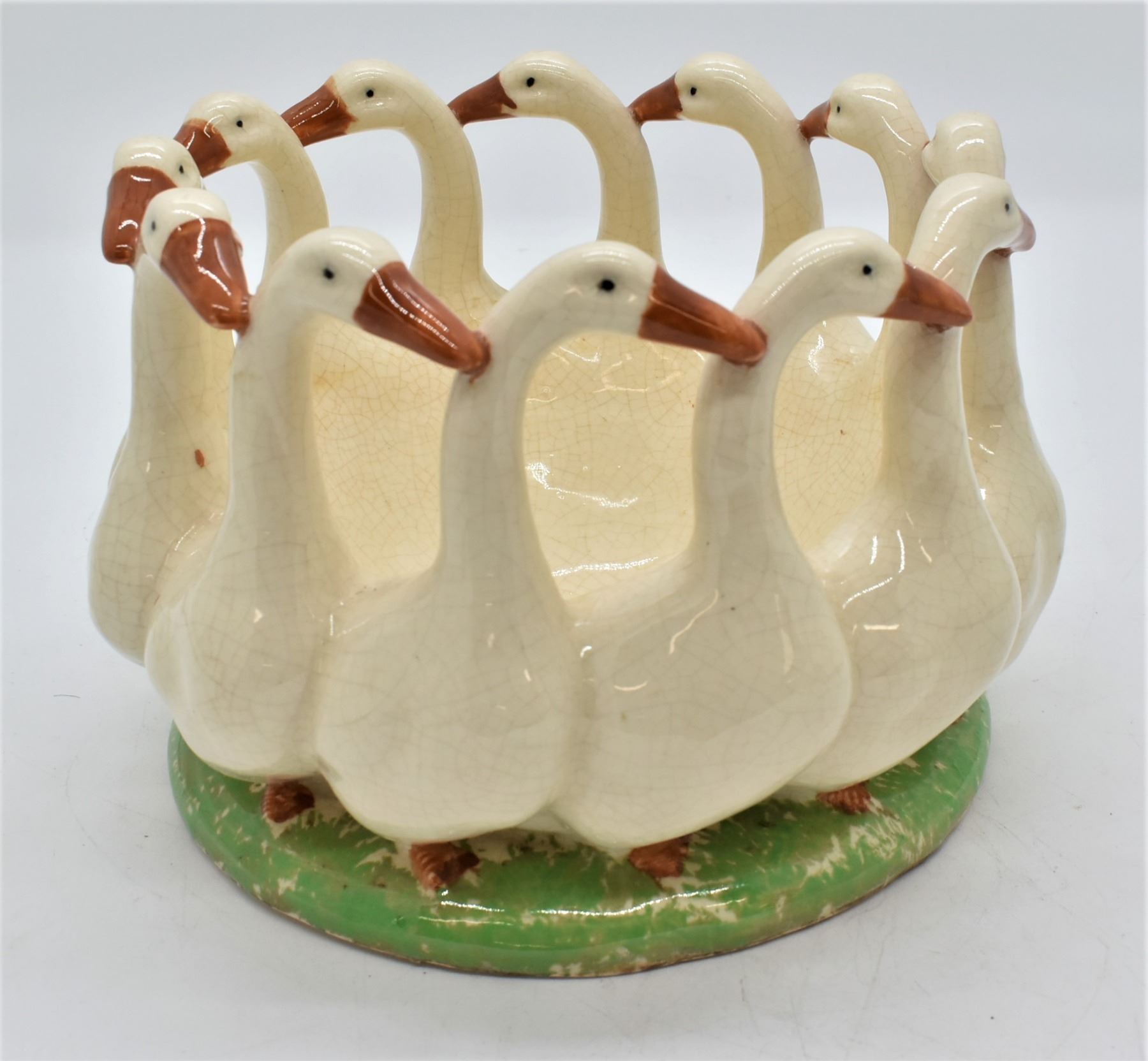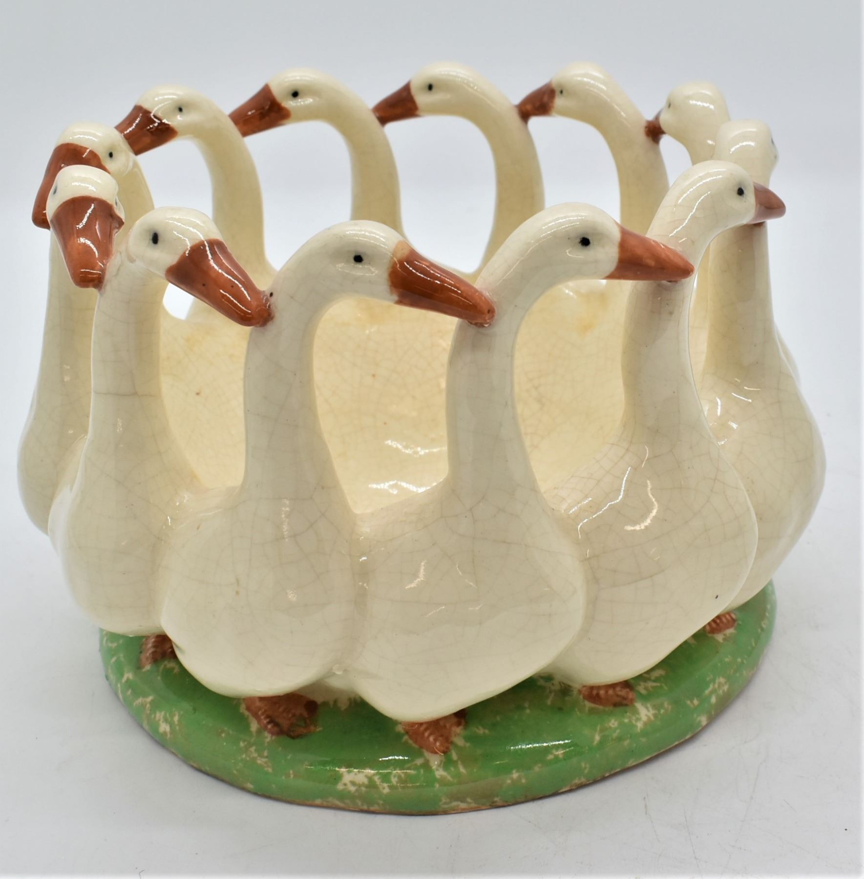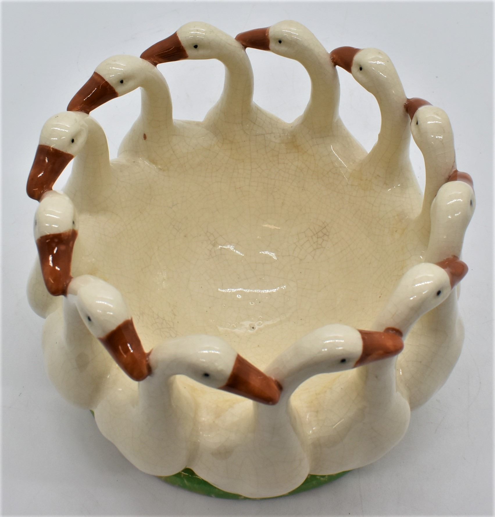 Vintage Japanese Gaggle of Geese Ceramic Pottery Planter, embossed mark on the bottom ''made in Japan'', measures 8''D x 5''H, crazing present commensurate with age