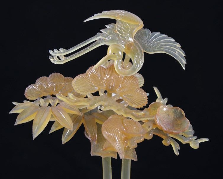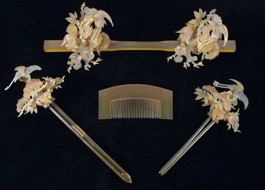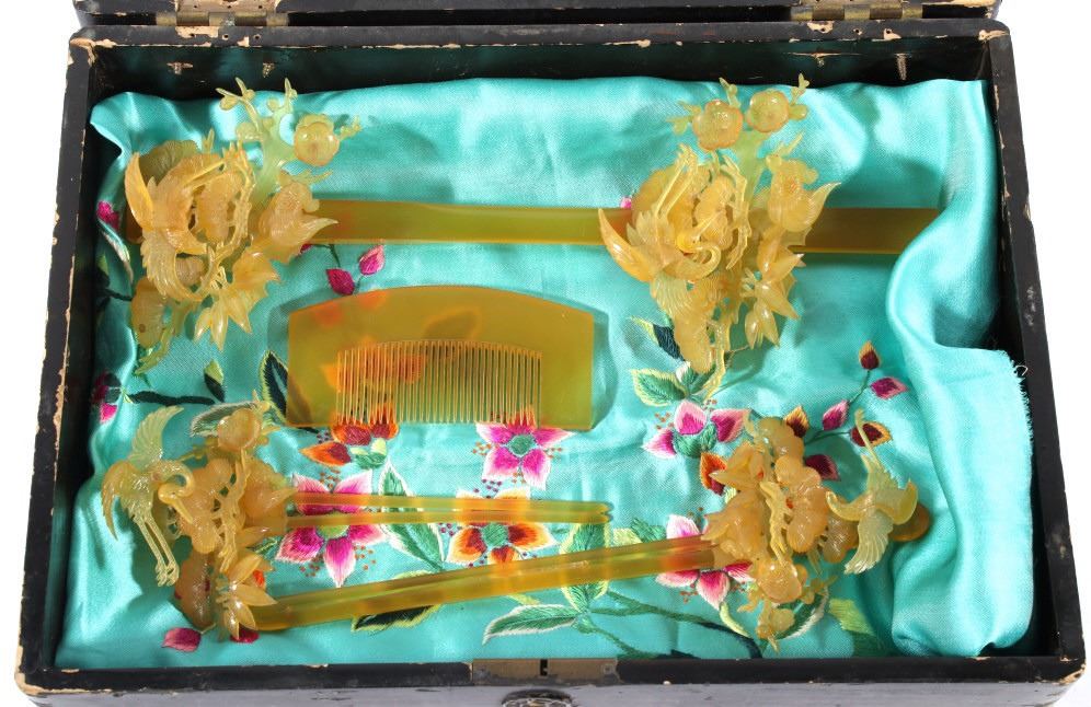 Included in this lot we have a set of ornate Japanese geisha accessories with painted storage box. The set shows plastic construction and originate from the early to mid 20th century. The set consists of three different kinds of hair pins as well as a comb. The pins feature detailed ornamentation showing a crane flying over an assortment of water plants with a turtle at the bottom. The pieces come in a black case with the image of a crane taking off with bamboo off to the side, painted in brown and red with some glint gold detailing. The interior shows a turquoise silk lining with stitched images of flowers in bloom. The case shows a brass lock and brass hinges. The hair pins show good condition overall with two showing damage to the crane. The box is in fair condition with visible wear across the piece. The box measures 10 3/4" wide by 7 3/4" deep and 3" tall with the longest of the hair accessories measuring 9 3/8" long and the ornaments measuring 4" wide by 2 1/4" tall by 1 3/4" deep.