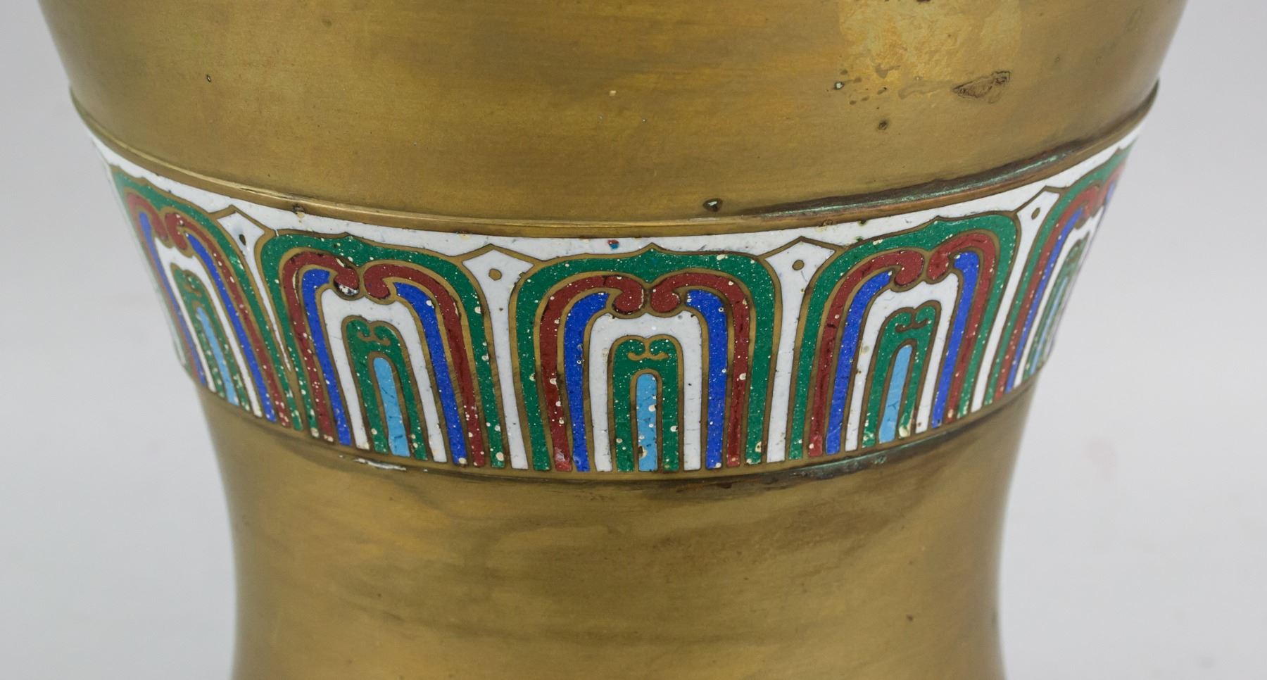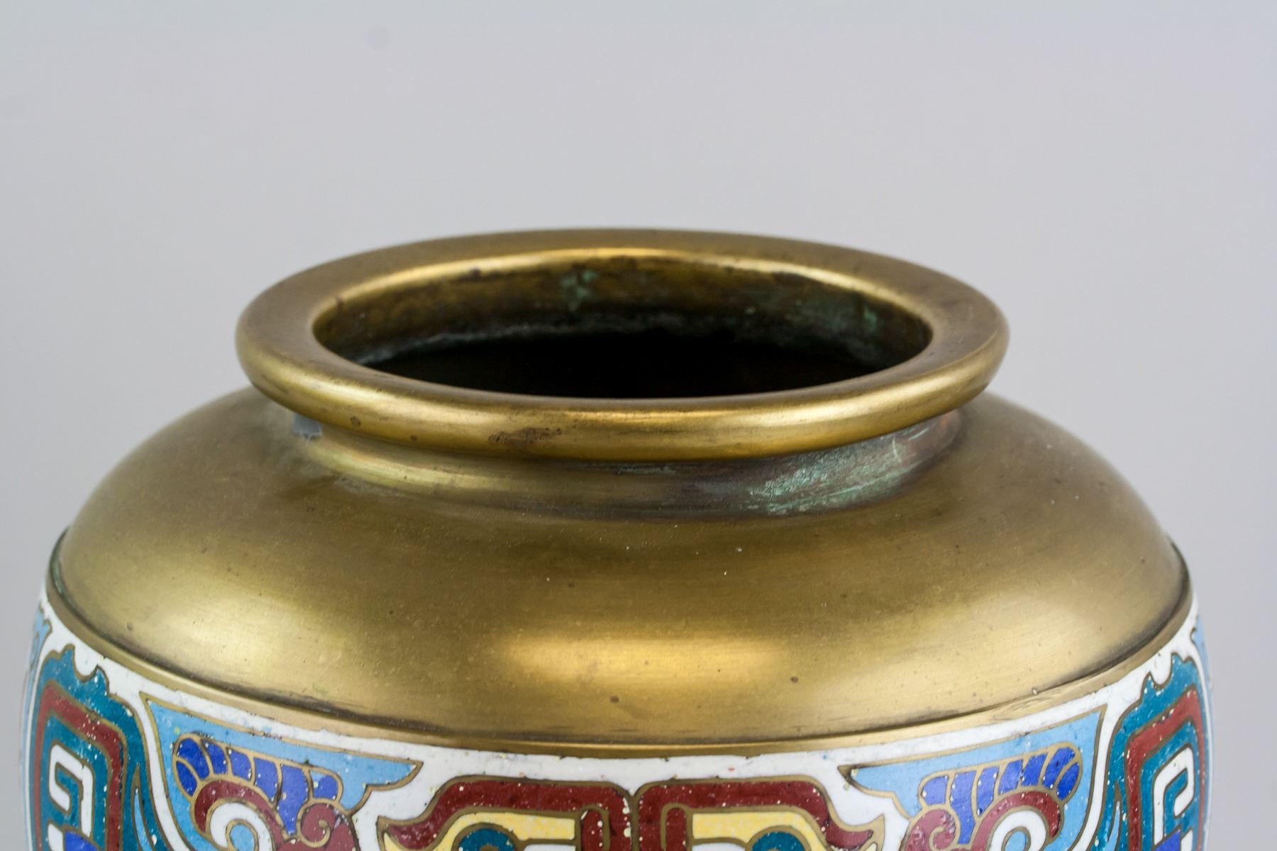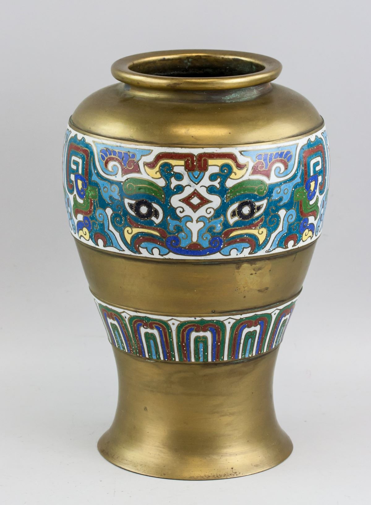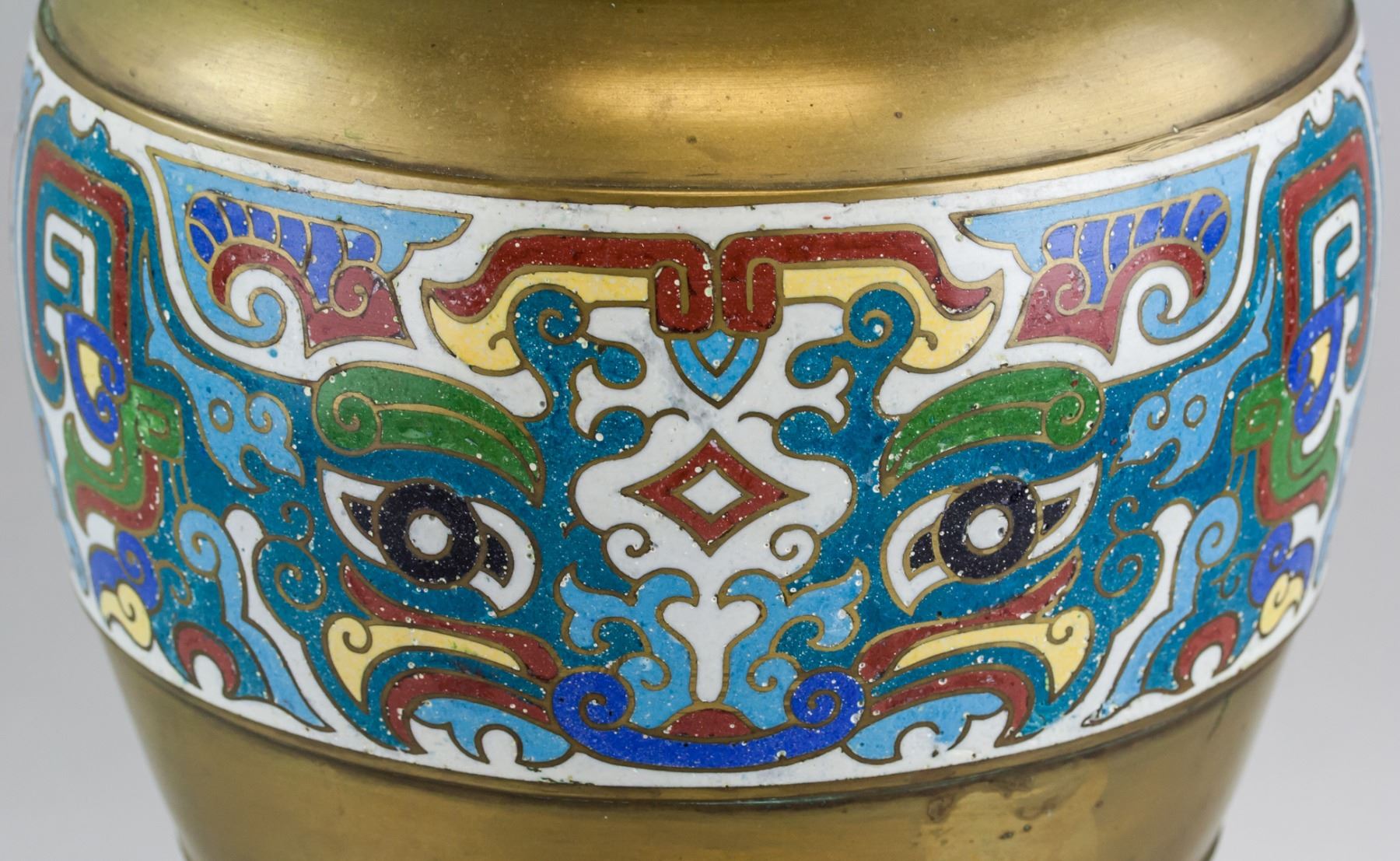 Japanese gilt bronze cloisonne vase. Of baluster form body. Painted with Taotie pattern.