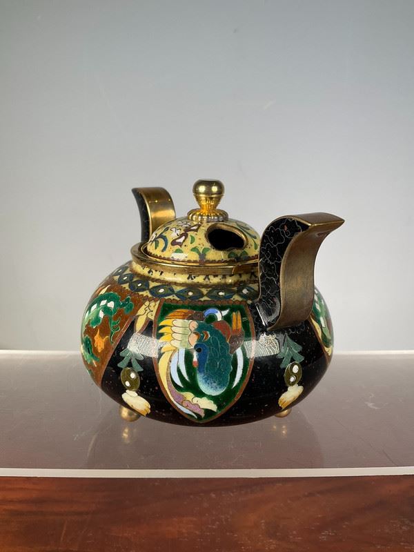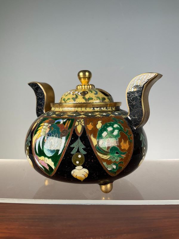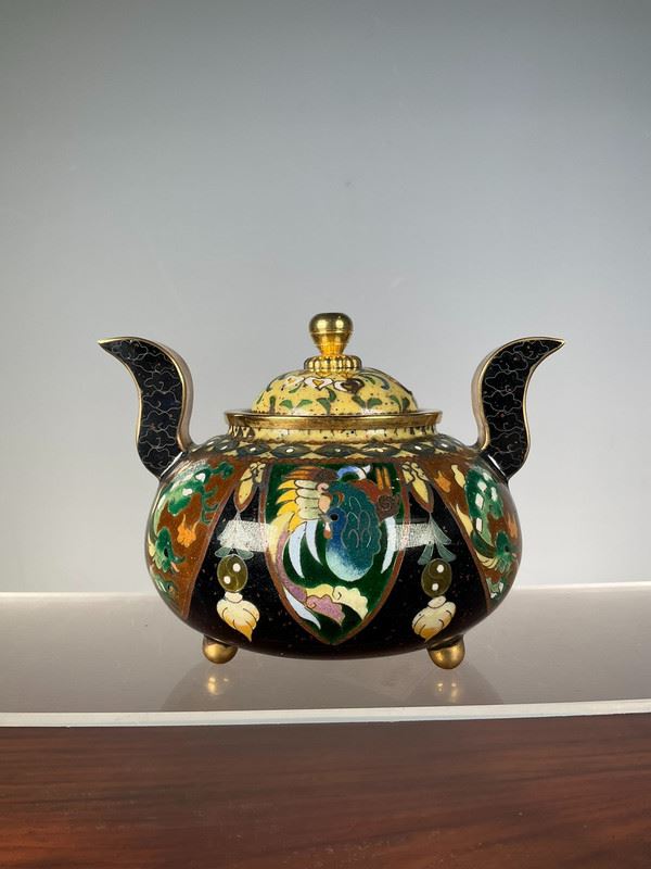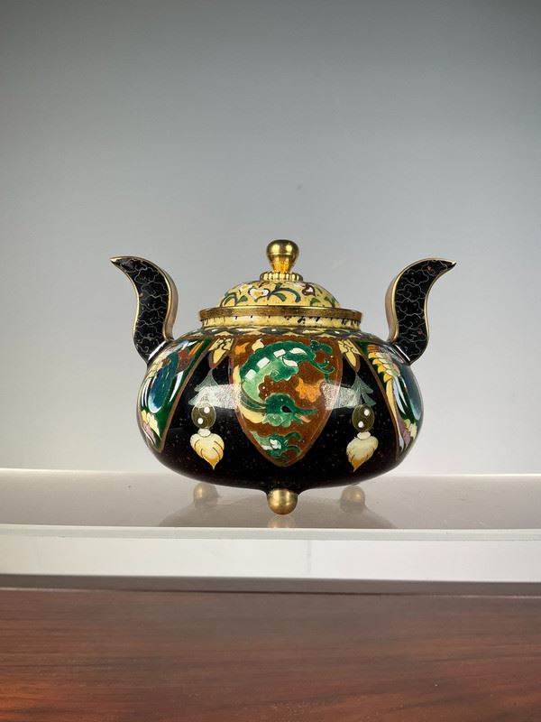 This Japanese gilt bronze cloisonné incense burner with double handles exemplifies refined craftsmanship and elegant design. The body is made of bronze, gilded with a brilliant golden finish. Adorned with cloisonné enamel, the vessel features vivid dragon and phoenix motifs, symbolizing auspiciousness and nobility. The double-handled design adds balance and grandeur, while the gilded lid and base create a striking contrast with the deep black enamel ground. This incense burner represents the unique fusion of Japanese metalwork and cloisonné artistry, making it both a functional object and a highly valuable collectible.