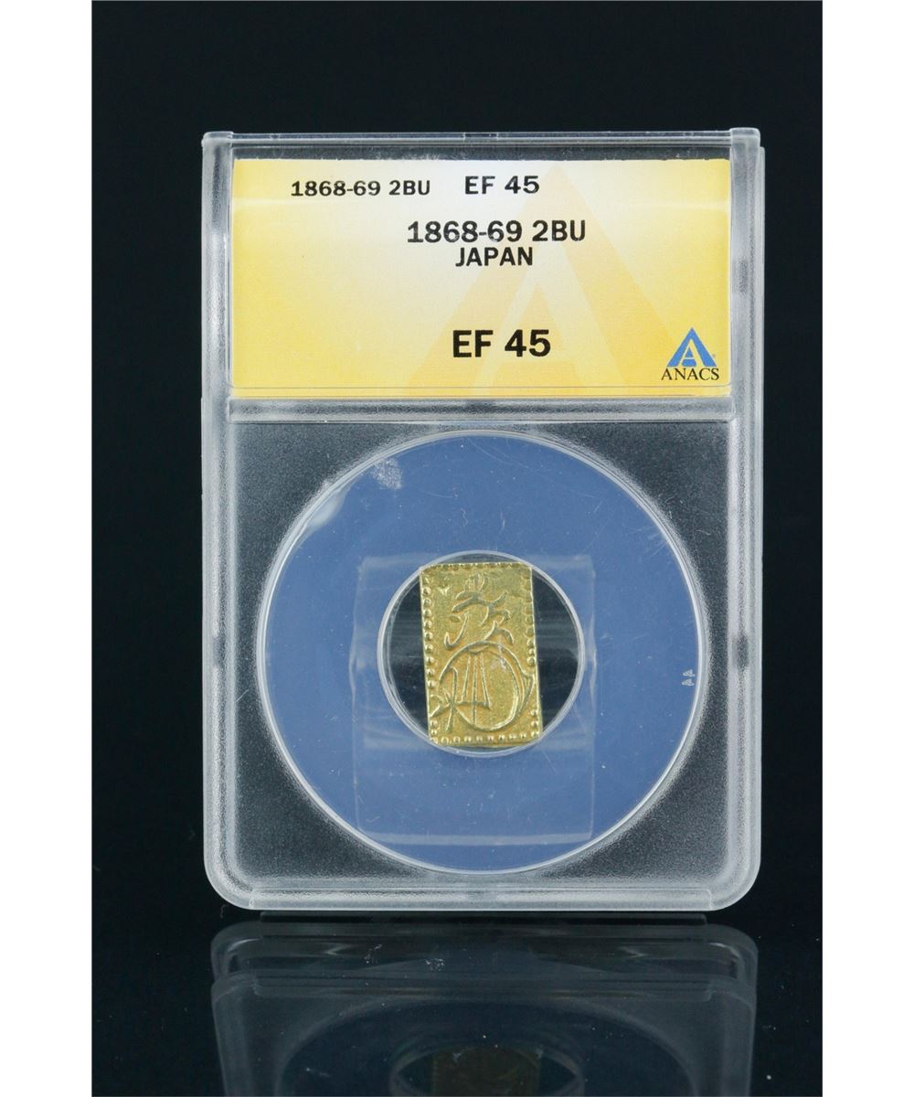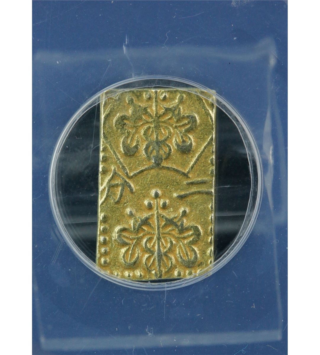 Japanese gold coin; sealed in a barcoded plastic case with AUTHENTICATED mark; of rectangular form with carvings of floral designs on both sides; H: 17 mm, W: 9 mm