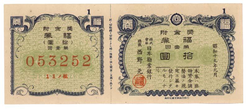 Lottery Bond for 10 yen. Issued late during the war, these paid no interest and the purchasers incentive in buying was the possibility of winning one of the large, periodic drawings. Uncancelled and Excellent.