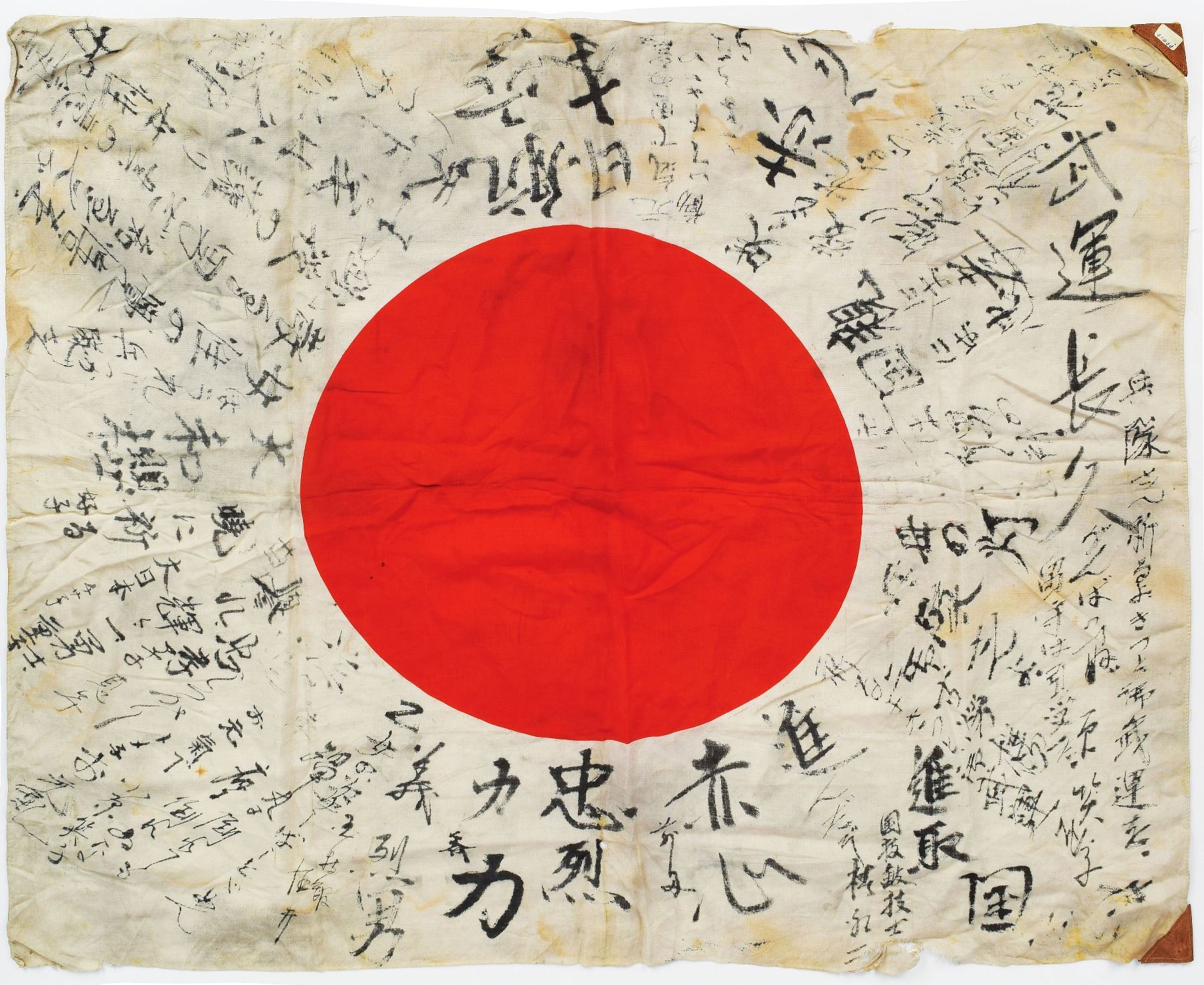 World War II–era personal 'Good Luck' flag of a Japanese soldier, 33 x 28, featuring a printed red 'sun' in the center of the white cotton field. Two corners are reinforced with leather triangles. It was customary for family and friends of the Japanese soldier to sign these 'Good Luck Flags' before he went off to battle. When unfurled on the ground, they would be used by Japanese soldiers as warnings to friendly aircraft not to strike. In very good condition, with scattered staining and fraying to edges.