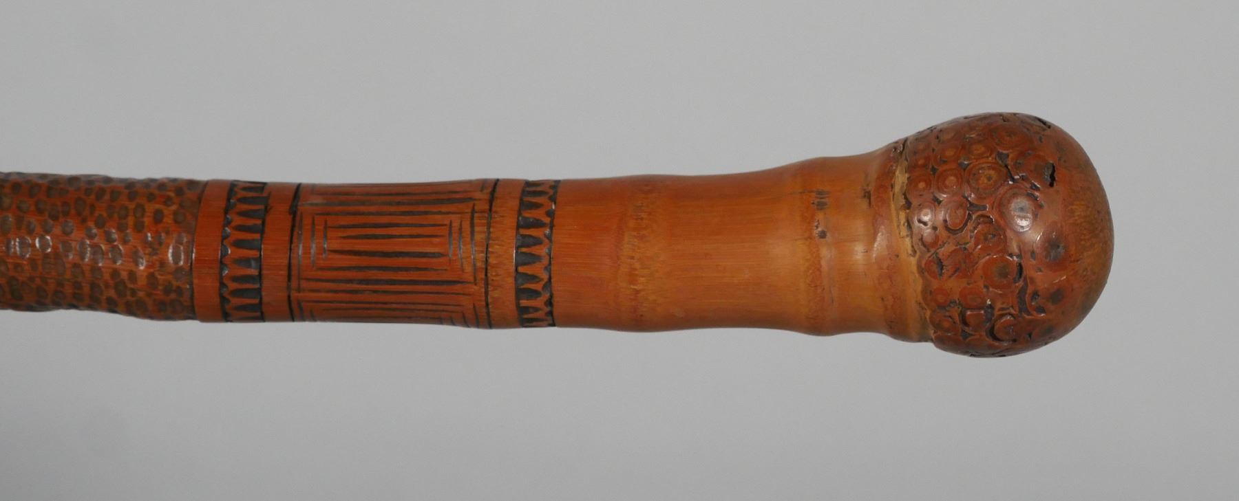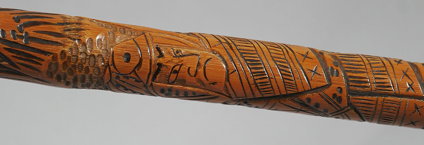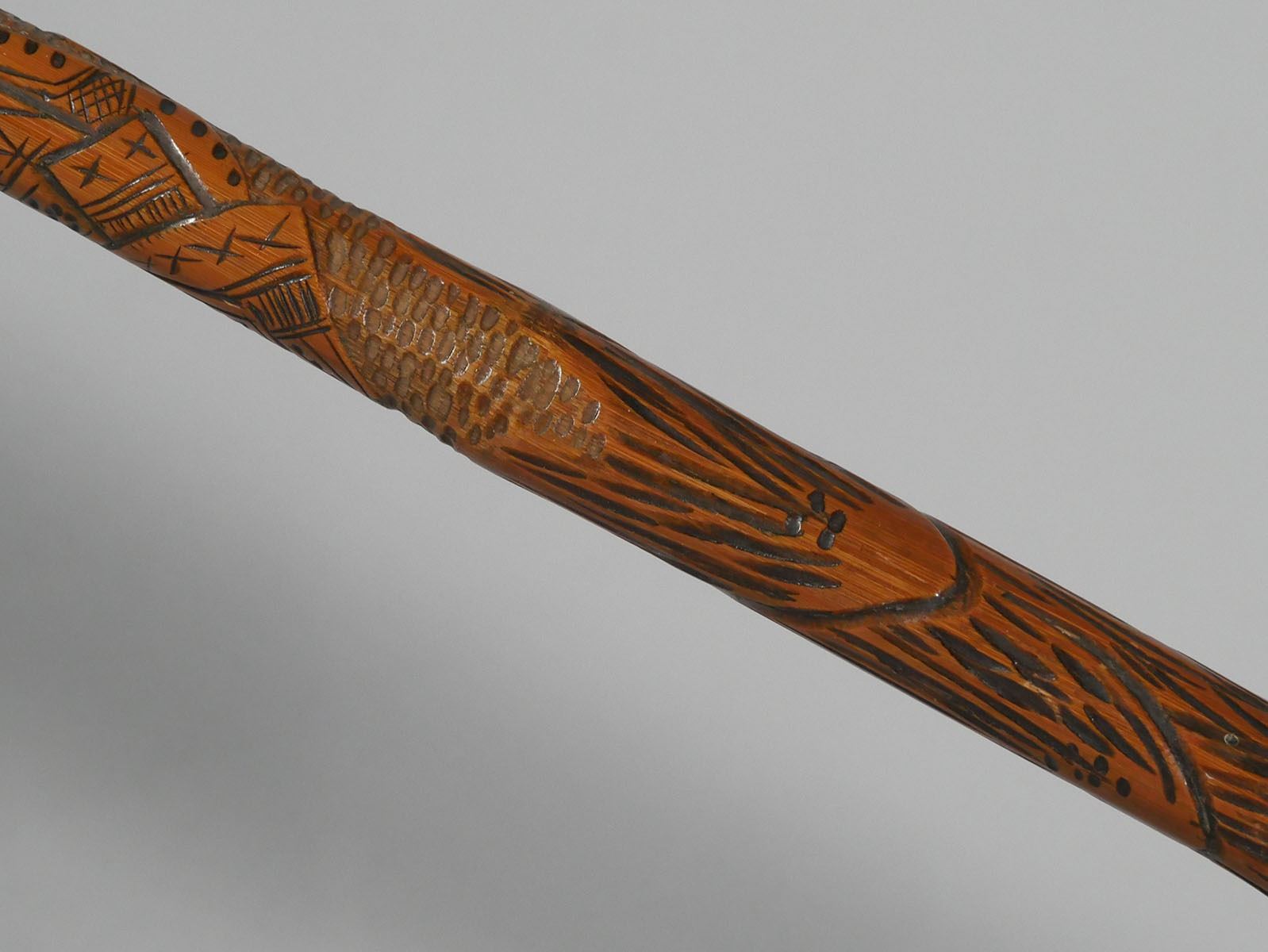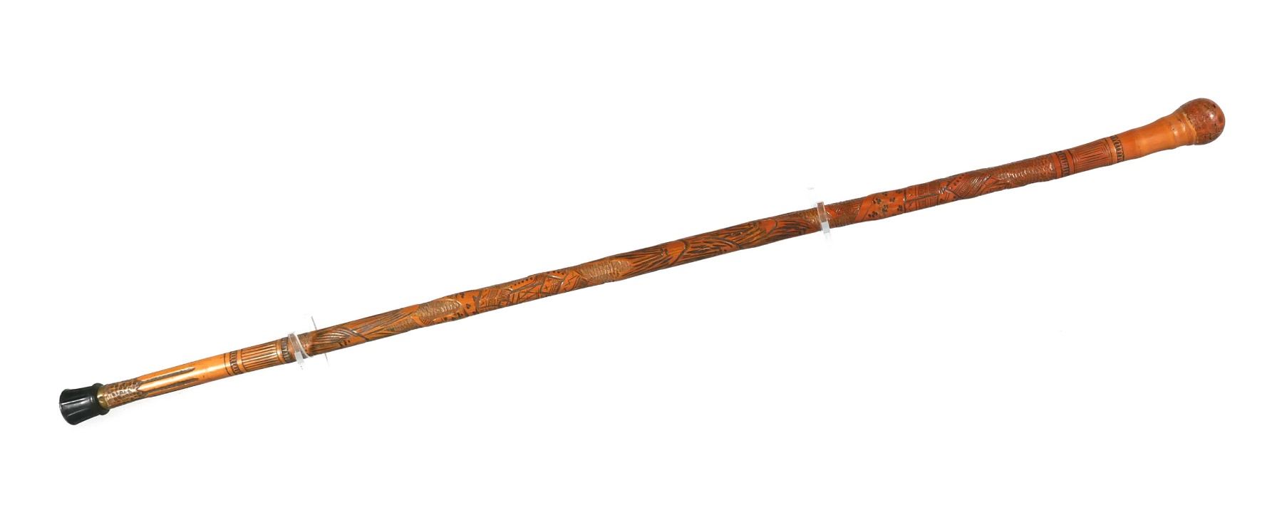 Hand carved Japanese walking stick, decorated with images of warriors. Measures 36" long. Excellent condition.