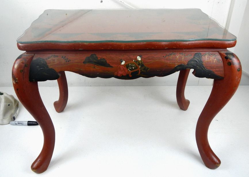 Japanese Hand Painted End Table - This piece is all hand painted and has a glass cut top. Measures 14.5"x25" and 20 1/8" tall.
