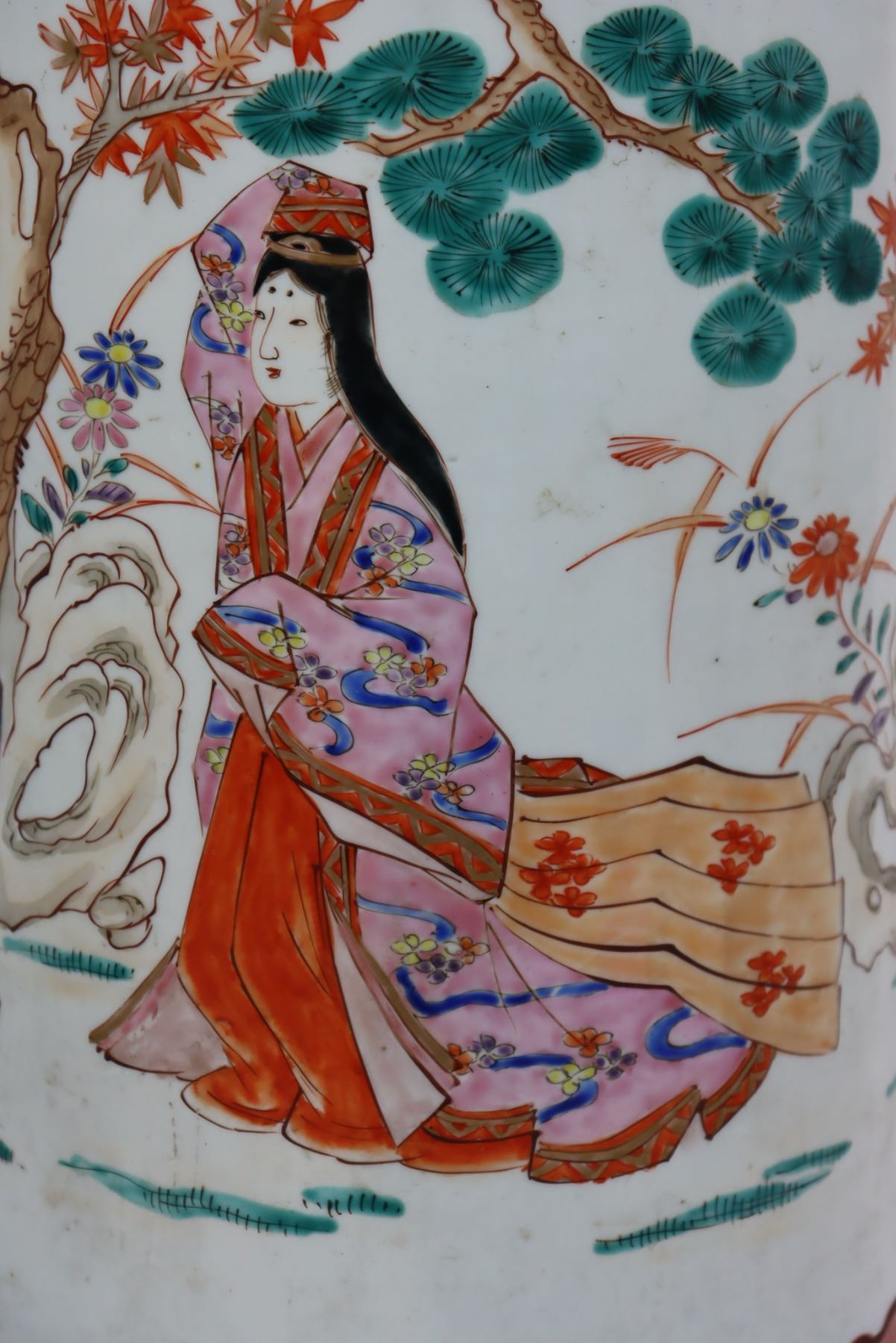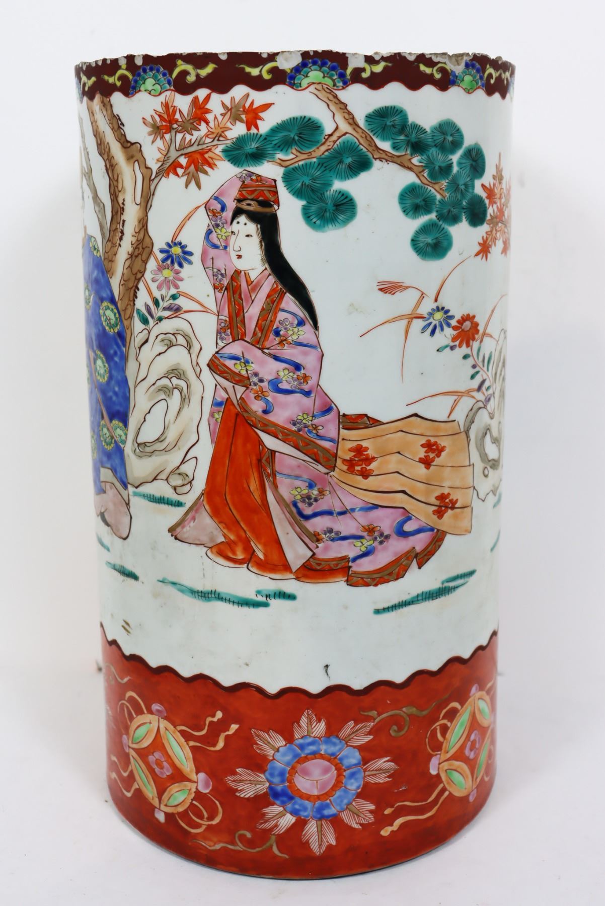Japanese hand painted porcelain brush pots with figural scenes. As is. Size: 15 x 8 1/2 in.