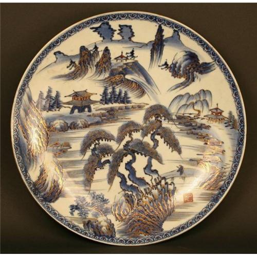 Large Meiji Period (circa 1900) Japanese Imari Porcelain Charger. Blue and white with gold accents, featuring an elegant stylized landscape and using sticking glazes to create a wonderful work of art. 16 inches, 41cm. From a widely renowned and published collection that has been exhibited at the Metropolitan Museum and Japan Society. Pristine Condition.