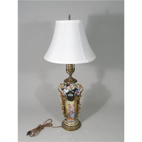 Japanese Imari Vase, Late 19thc. - Lovely, Lovely! Imari lamp with hand painted shepherdess to the front, all over decoration of butterflies and flowers. Applied gilded bamboo motif handles mounted on brass tone base. Electrified, wear to gilt on handles. 28"h