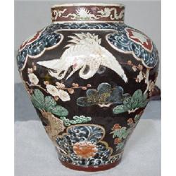 A large ovoid shaped porcelain vase decorated with cranes, rabbits, trees and flowers etc. in blue, black, red and green glaze. Fine condition with three minor chips to top rim. Japan, Late 17th C. 11" (28 cm) H.