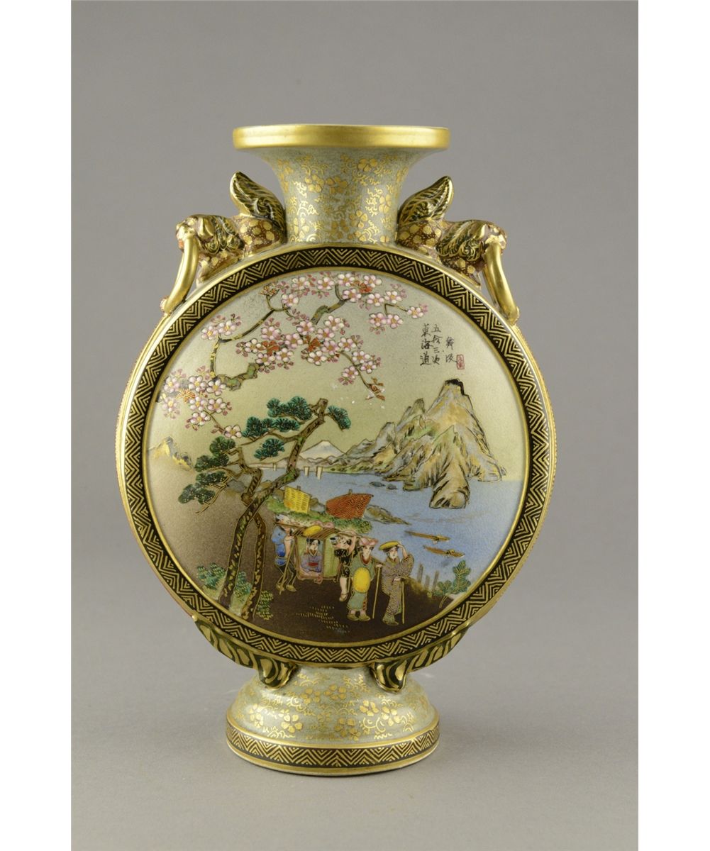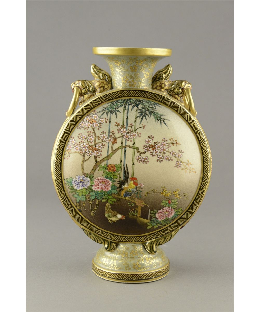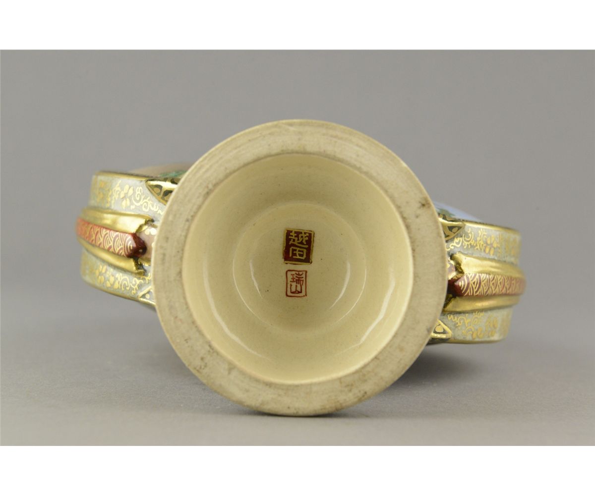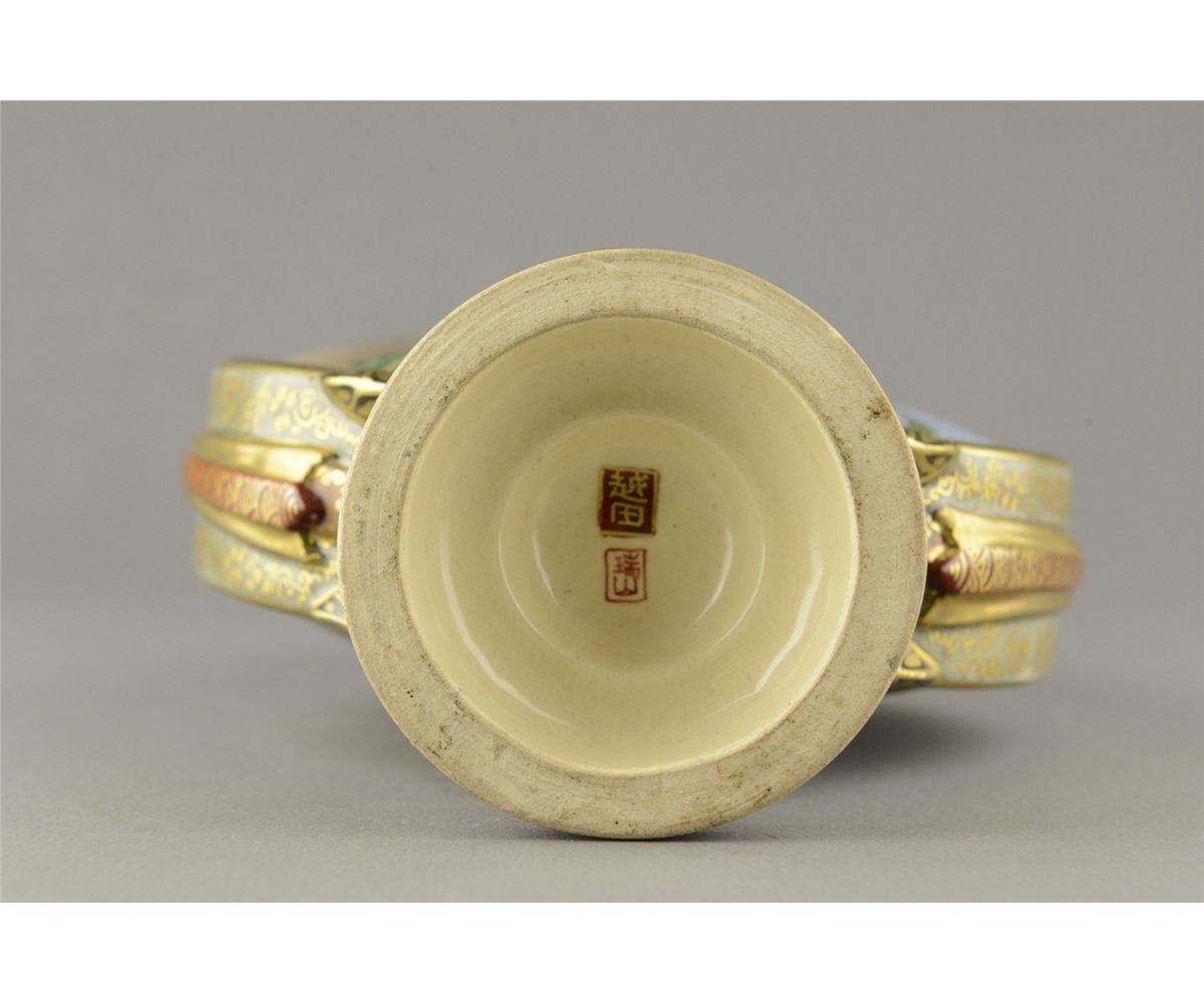 With incredible details, the porcelain moon vase is enamel painted with roaster, blossoms and landscape framed in stylized golden frame. Shoulder flanked with pair of fu dogs. Bottom marked Yue Tian Rui Shan. H: 21.6 cm, W: 6 cm.