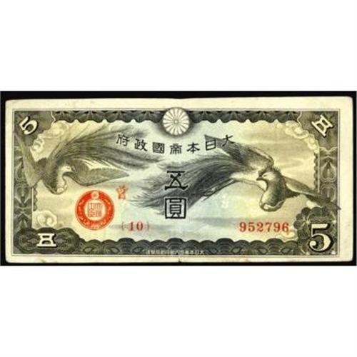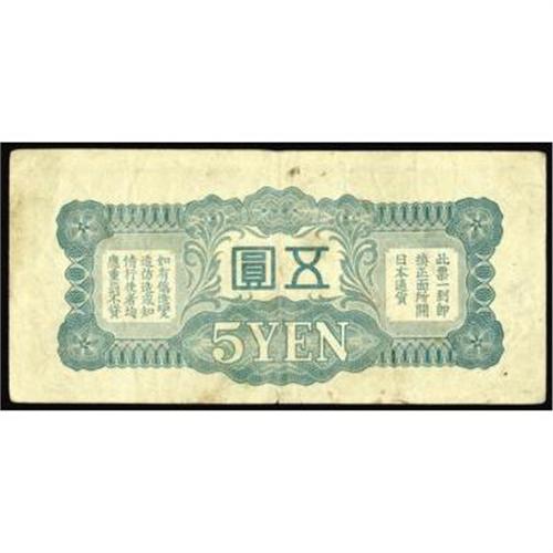 <style type="text/css"> body, td, th { font-family: Arial, Helvetica, sans-serif; font-size: 12px; color: #482424; margin: 0px; padding: 0px; } #header { background-image: url(http://www.bowersandmerena.com/ebay/images/template_v3_01.gif); clear: both; background-color: #590303; border-top-width: 2px; border-top-style: solid; border-top-color: #B38C4F; } #header #header_wrapper { height: 75px; clear: both; width: 800px; margin-right: auto; margin-left: auto; background-image: url(http://www.bowersandmerena.com/ebay/images/template_v3_03.gif); background-repeat: no-repeat; background-position: right; color: #F3EDCC; } #header #header_wrapper #header_logo { float: left; height: 75px; width: 444px; background-image: url(http://www.bowersandmerena.com/ebay/images/template_v3_02.gif); background-repeat: no-repeat; font-size: 10px; text-transform: capitalize; color: #B38C4F; } #header #header_wrapper #header_right { float: left; height: 75px; width: 356px; text-align: right; } #header #header_wrapper #header_right #headerLoginBtn { margin-bottom: 30px; } #header #header_wrapper #header_right input#txtSearch { color: #B49056; border: 1px solid #B49056; width: 175px; padding-top: 3px; padding-right: 3px; padding-bottom: 4px; padding-left: 3px; } #nav { height: 37px; background-image: url(http://www.bowersandmerena.com/ebay/images/template_v3_05.gif); clear: both; } #nav #nav_wrapper { height: 35px; width: 800px; margin-right: auto; margin-left: auto; border-left-width: 1px; border-left-style: solid; border-left-color: #B38C4F; } #nav #nav_wrapper a { padding-right: 15px; padding-left: 15px; border-right-width: 1px; border-right-style: solid; border-right-color: #B38C4F; height: 25px; padding-top: 10px; display: block; float: left; text-decoration: none; font-weight: bold; color: #5D0303; } #nav #nav_wrapper a:hover { color: #B38C4F; } #nav #nav_wrapper #search { float: right; padding-top: 7px; } #nav #nav_wrapper #search #txtSearch { font-family: Arial, Helvetica, sans-serif; font-size: 10px; text-transform: uppercase; color: #D2AE75; border: 1px solid #B38C4F; padding: 3px; } #content_bgd { background-image: url(http://www.bowersandmerena.com/ebay/images/template_v3_09.gif); background-repeat: repeat-y; background-position: center; padding-top: 15px; padding-bottom: 15px; background-color: #FBFBDB; } #content_wrapper { clear: both; height: auto; width: 800px; margin-right: auto; margin-left: auto; } .LotDetailWhite { line-height:normal; font-size:13px; font-family: arial,helvetica,sans-serif; color: White; font-weight: bold; } .LotDetailInformation { line-height:normal; font-size: 13px; font-family: arial,helvetica,sans-serif; } .LotDetailMessage { line-height:normal; font-size: 13px; font-family: arial,helvetica,sans-serif; color: red; } } tr.HeaderAuctionTitle td { color: #000000; font-weight: bold; padding: 2px; background-image: url(http://www.bowersandmerena.com/ebay/images/template_v3_05.gif); background-repeat: repeat-x; border-bottom-width: 1px; border-bottom-style: solid; border-bottom-color: #B38C4F; } table.AuctionSummary a, table.AuctionSummary a:link, table.AuctionSummary a:visited { color: #0000FF; text-decoration: none; } } td.tableHeaderLeft { border-left-width: 1px; border-left-style: solid; border-left-color: #B38C4F; } td.tableHeaderRight { border-right-width: 1px; border-right-style: solid; border-right-color: #B38C4F; } td.tableCellMiddle { border-left-width: 1px; border-left-style: solid; border-left-color: #B38C4F; border-right-width: 1px; border-right-style: solid; border-right-color: #B38C4F; padding: 5px; } tr.footer td { border-top-width: 1px; border-top-style: solid; border-top-color: #B38C4F; } </style> </head> <body> <div id="header"> <div id="header_wrapper"> <div id="header_logo"> </div> <div id="header_right"> </div> </div> </div> <div id="nav"> <div id="nav_wrapper"> <a href="http://www.bowersandmerena.com">Our eBayLive Auctions</a> <a href="#PaymentInfo">Payment Information</a> <a href="#ShippingInfo">Shipping Information</a> <a href="#About">About Bowers and Merena</a> </div> </div> <div id="content_bgd"> <div id="content_wrapper"> <table width="100%" border="0" cellpadding="5" cellspacing="0" class="AuctionSummary"> <tbody> <tr class="HeaderAuctionTitle" style="height: 25px;"> <td align="left" class="tableHeaderLeft" > </td> <td align="center" class="tableHeaderRight"> <span style="font-size: large;">Lot #437. Japanese Military. Japanese Imperial Government, 1939-40 ND Issue.</span> </td> </tr> <tr> <td colspan="3" class="tableCellMiddle"> Red seal on face reads "Prize" or "Presentation". ND (1940). 5 Yen, P-M17a, VF.